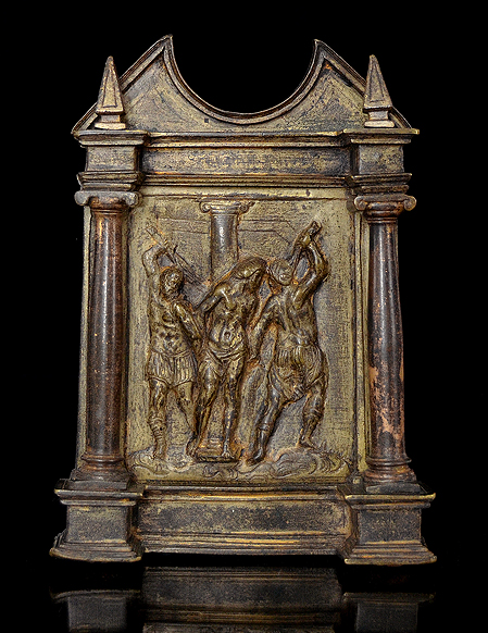 The present pax features a small relief of the Flagellation loosely following after Sebastiano del Piombo’s (1485-1547) fresco of the Flagellation of Christ, ca. 1516-24, in St. Peter’s Basilica in Rome. The subject, whose design was provided to Piombo by Michelangelo (1475-1564), was widely successful and can be found frequently reproduced in small relief on numerous devotional objects created in Spain during the 16th and 17th centuries.
