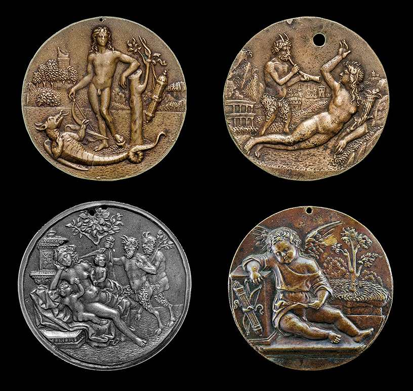 A bronze plaquette of Apollo and the serpent Python, here attributed to Francesco Francia or circle, ca. 1506-07 (ex-Brockmann collection; top-left); A bronze plaquette of Abundance and a Satyr, here attributed to Francesco Francia or circle, ca. 1506-07 (ex-Brockmann collection; top-right); A bronze plaquette of an Allegory of Virtue and Vice, here attributed to Francesco Francia or circle, ca. 1500-07 (Budapest Museum of