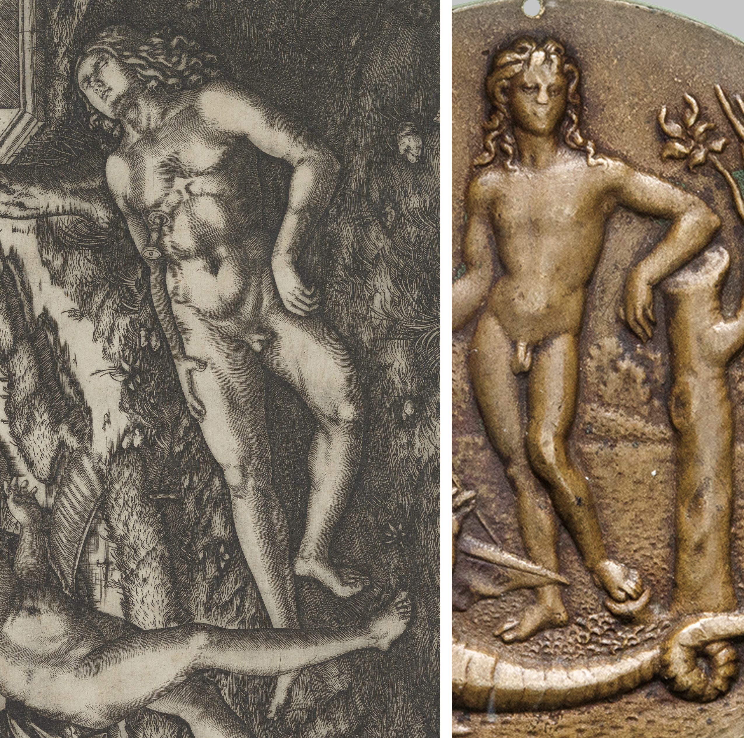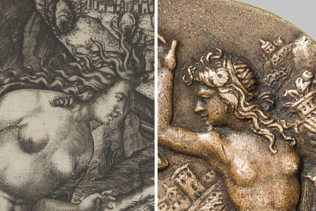 Fig. 19: detail of an Allegory of Virtue and Vice plaquette (Budapest Museum of Fine Art) (left); niello print of Mercury Delivering the Infant Bacchus, attributed to Peregrino da Cesena, ca. 1500 (British Museum; Inv. 1845,0825.135)