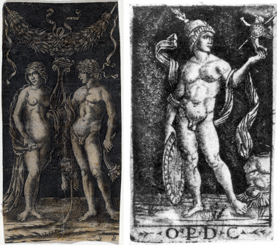 Fig. 08: Niello print of Hercules and Deianara, ca. 1490-1510, attributed to Francesco Francia or Peregrino da Cesena (National Gallery of Art; Inv. 1943.3.6684) (left); niello print of Diomede removing palladium from the Trojan acropolis by Peregrino da Cesena, ca. 1490-1510 (Bibioltheque Nationale, Paris) (right)