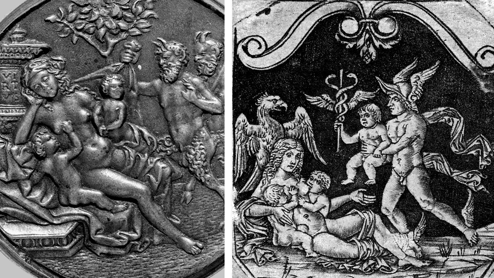 Fig. 14: Detail of an engraving of a Satyr Family by Albrecht Dürer, 1505 (Central Archives of Historical Records, Warsaw, Poland) (left); detail of an Abundance and a Satyr plaquette (ex-Brockmann collection) (right)