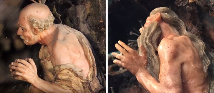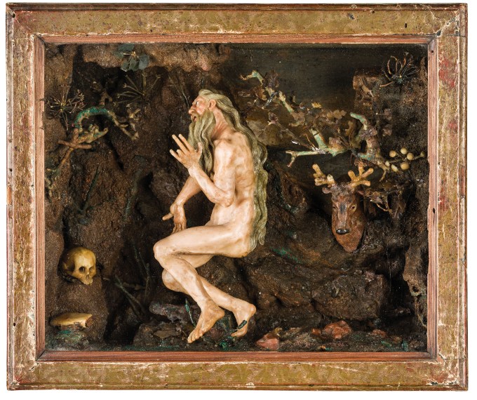 Apart from her dramatically complex compositions in large scale, like those in Catanzaro, she also specialized in scenes of saints. One example is her previously cited Magdalene in Adoration belonging to the Cavallini Sgarbi collection. Of similar scale to the Jerome is also the Jerome in the Desert in Harvard University’s Museum (Inv. 1966.80). The diorama is alike in its simplicity, relying on a painted background with wax surrounds to build-up the scene.