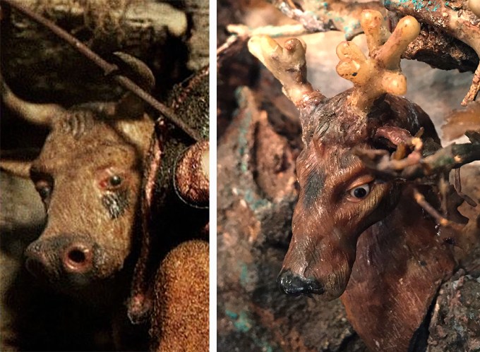 The present work. approximately 23 x 28 cm, depicting a Penitent St. Jerome in the Wilderness (Fig. 01) may be attributed to Caterina de Julianis on stylistic grounds. There is an immediate relationship observed between the character of Jerome and Father Time as featured in Caterina’s Time and Death3 (Fig. 02; Victoria & Albert Museum [V&A}, Inv. A.3-1966). The physiognomy is alike and the expression of both protagonists is commensurate (Fig. 03). However, finer details confirm her signature style. From a materials perspective, the polychrome of the flesh and hair use the same formulaic tones as observed on her signature works. The employ of glass eyes to capture expressive realism is alike as is the use of silk flowers and wax-modeled foliage sprouting from their environs with a painted backdrop on wood panel. Stylistically, the pursed brow, agitated eyes, agape mouth, featuring superbly modeled teeth, along with spiraling hair delineated by long striations are completely alike between the figure of Jerome and that of Father Time in an Allegory of Time at the Chiesa dell’Immacolata in Catanzaro (Fig. 04). The emaciated figure of Jerome’s exposed back recalls also the anatomical character of the right-most attendant in her Adoration of the Shepherds also at Catanzaro (Fig. 05). Likewise comparable is the figure of the bull within her Adoration and that of the deer in the diorama of Jerome, which would have hovered over the back of a prostrate lion, now lost. The characteristic animal hair, formed by striations in the wax which are lengthy and densely packed is relatable (Fig. 06). Lastly, there is an apparent correlation between the book and skull in the Jerome and those featured similarly on her autograph Mary Magdalene in Adoration from 1717 (Fig. 07).