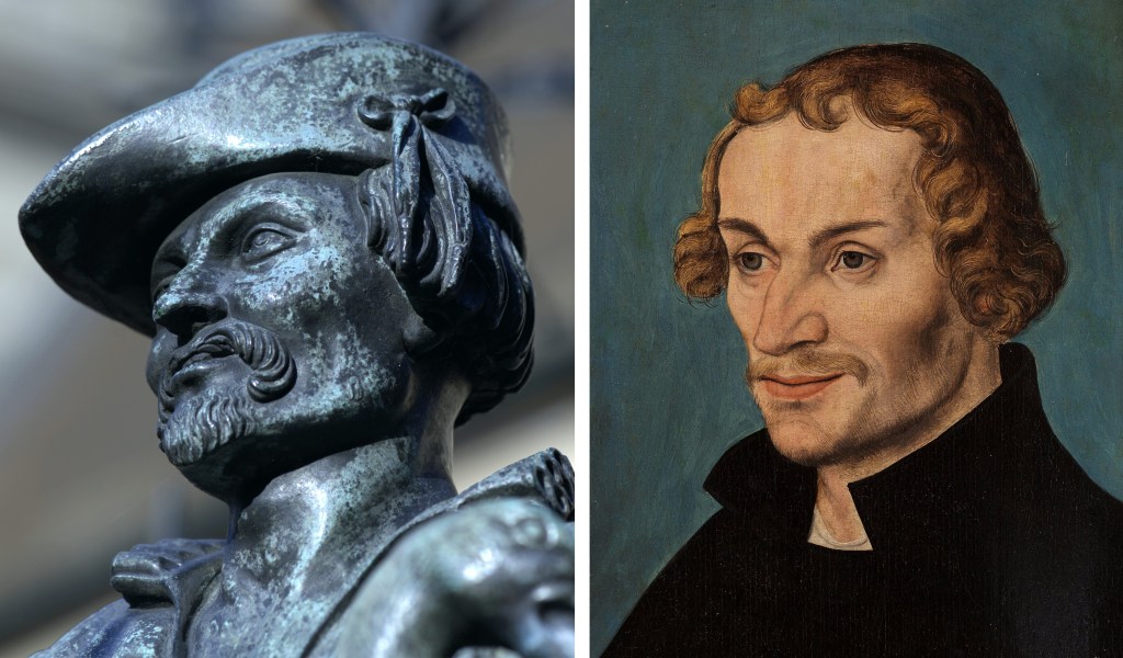 Evidence that the figure on the Gänsemännchenbrunnen portrays Melanchthon is confirmed by contemporary portraits of him. During Melanchthon’s visits to Nuremberg in 1525-26, Albrecht Dürer sketched a profile portrait of him which he translated in engraved form (Fig. 04). Although our statue wears a fashionable cap, the physical characteristics of Melanchon’s appearance correspond with his gaunt features, the trimmed length of his hair and the inclusion of a mustache and goatee. The hair along his lower jaw is also portrayed when observing the sculpture closely, realized in low-relief by a wispy tuft on each cheek. A portrait of Melanchthon by Lucas Cranach the Elder in 1537, adds further credence to the identity of the figure while Hans Holbein’s portrait of Melanchthon reproduces the fashion preference displayed in the sculpture: a coat worn atop a descending open V-necked shirt (Figs. 05, 06).