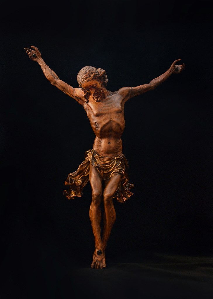 The corpus also shares analogies with another fruitwood corpus, twice-its-scale, attributed to a sculptor active in the circle of Permoser (Fig. 03).4 The masterful approach in articulating Christ’s suffering on this additional corpus is adept while the management of the perizonium’s drapery is forcefully unique and dramatic. Its maker is yet-to-be-identified although its hulking upper chest, situated atop a thinly cinched waist, with idiosyncratic brows delineated by angled strokes forming an arrow-like pattern, suggest a tentative regional relationship between the two wooden corpora. The advanced accomplishment of the larger corpus may suggest a work one or more decades ahead with its early Rococo tendencies. It is certainly a masterwork in the shadow of Permoser’s influence.