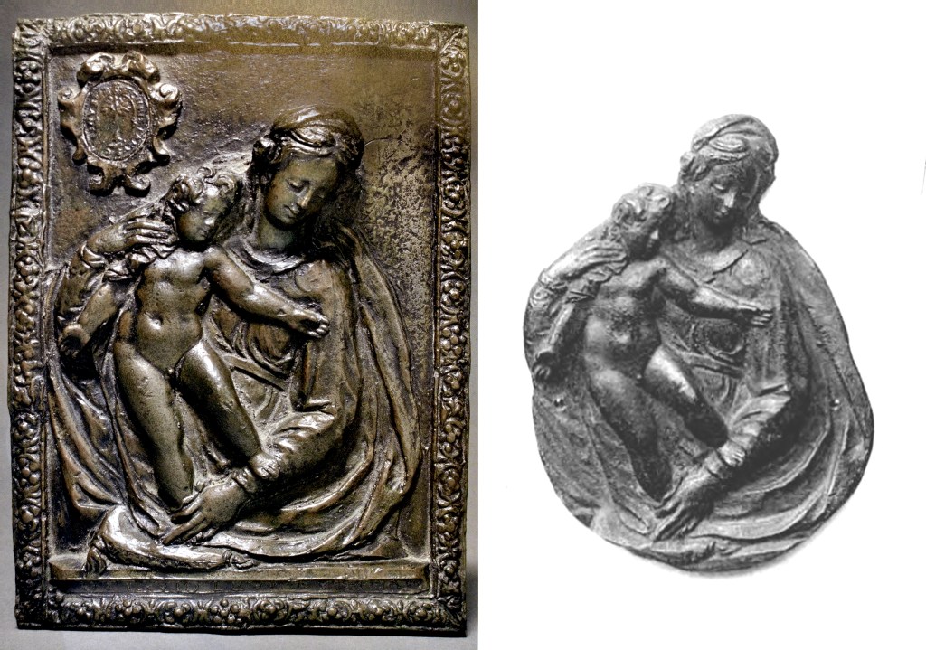 Ottavio’s signed plaque of a half-length Virgin and standing Child 30 is autographed along its base and features the armorial of its patron (fig. 6, left). Avery commented on its apparent influence from the Venetian school of Jacopo Sansovino while a silhouetted example in Berlin31 was earlier judged the same by Bode32 and Ernst Bange (fig. 6, right).33 The silhouetted example in Berlin may preserve the vestige of a workshop model. Although it lacks the left side of the pillow supporting the child Christ’s foot and is missing some of the weighted draperies along its left margin, it is evident Ottavio originally employed a similar silhouetted model which he pressed into a plain ground to conceive his autographed plaque. The bordered frame of Ottavio’s plaque appears piecemealed from a stamped mold used to create its border, much in the same way decorative treatments were applied to models for casting mortars. That Ottavio proudly signed the recto of this plaque is more suggestive of an original invention than a founder’s mark and therefore may indeed be the unique invention of the founder.
