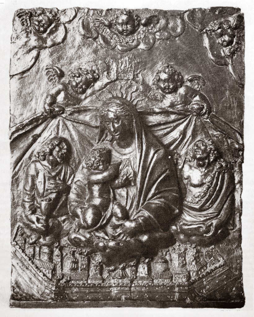 The plaquette of the Virgin and Child, from which Paolo and Francesco’s model derives, is largely accepted as a work from the school of Donatello or after a lost composition by the master made in Florence or Padua during the second quarter of the 15th century.18 Alternatively, the relief has also been associated with Giovanni da Pisa, as first suggested by Wilhelm von Bode.19 The plaquette enjoyed a reasonable circulation with Francesco Rossi citing more than fifty examples of the plaquette in various versions.20 An applique variant of the plaquette suggests their use for setting into paxes and could also have been used as a model for bell and mortar founders. For example, Jeremy Warren notes a 1590 bell from the Veronese workshop of Giulio and Ludovico Bonaventurini which reproduces the motif.21 If Paolo and Francesco did not reference the plaquette as the source for their free version of the composition they may have alternatively borrowed it from a 1511 relief on the façade of the Ospedale dei Pover Sarti in Venice, which Leo Planiscig observed as inspired by the plaquette composition.22