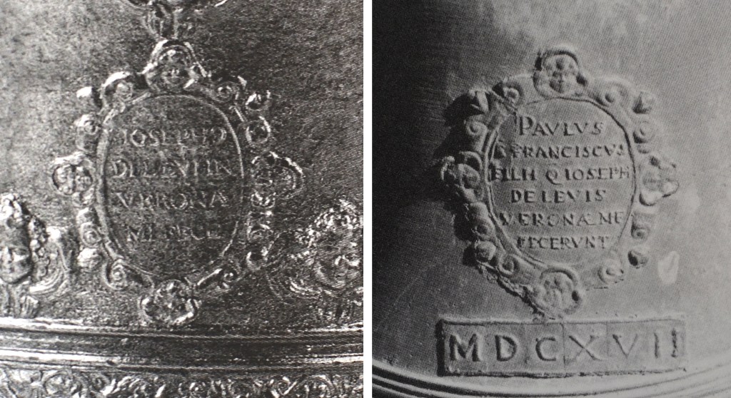 17 Avery (2016): Joseph de Levis & Company, no. 70, p. 146. The unsigned 1609 bell for the Borgnolico family may be conceivably ascribed to Paolo and Francesco de Levis. The earliest signed work of Paolo de Levis, now lost, was dated 1611, made for the Confraternitá della SS. Trinitá at the chapel of San Biagio in Verona. Avery (2016): Joseph de Levis & Company, nos. 56-57, p. 140.