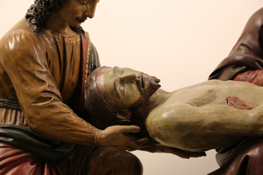 Specifically, our sculpture represents a fragment for what would have formed the full figure of Christ belonging to a compianto or Lamentation group of free-standing sculptures executed in wood, modeled further in stucco and painted in vibrant color. The figure of Christ would have been shown reclined, laid supine on the floor or stage and surrounded by mourners. Other such groups, were executed in-and-around Florence like those observed realized in terracotta by Michele da Firenze (Galleria Estense) one attributed to Leonardo del Tasso, ca. 1490 (Fig. 02, Berlin Museums), or another in the ambit of Baccio da Montelupo, ca. 1515-20 (Museo d’Arte Sacra di San Francesco di Greve in Chianti).