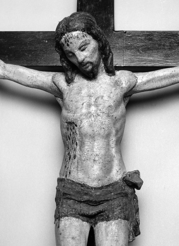 The distinctive tubular corkscrew curls present on the hair and beard of the present Christ are superficially analogous with those belonging to a crucifix ascribed to Giuliano da Maiano or his ambit at the Cardini Chapel in the Church of San Francesco in Pescia while the overall disposition of Christ’s face is reflective of crucifixes by Benedetto da Maiano like the documented example executed toward the end of his career at the cathedral of Santa Maria del Fiore and especially the crucifix kept at the oratory of Santa Maria della Misericordia in Florence, adjudged ca. 1478, which originally belonged to Benedetto’s estate upon his death (Fig. 03). Although this crucifix is heavily overpainted, the general form of its underlying sculpted character is commensurate with our present head of Christ, especially when observed in-profile (Fig. 04).