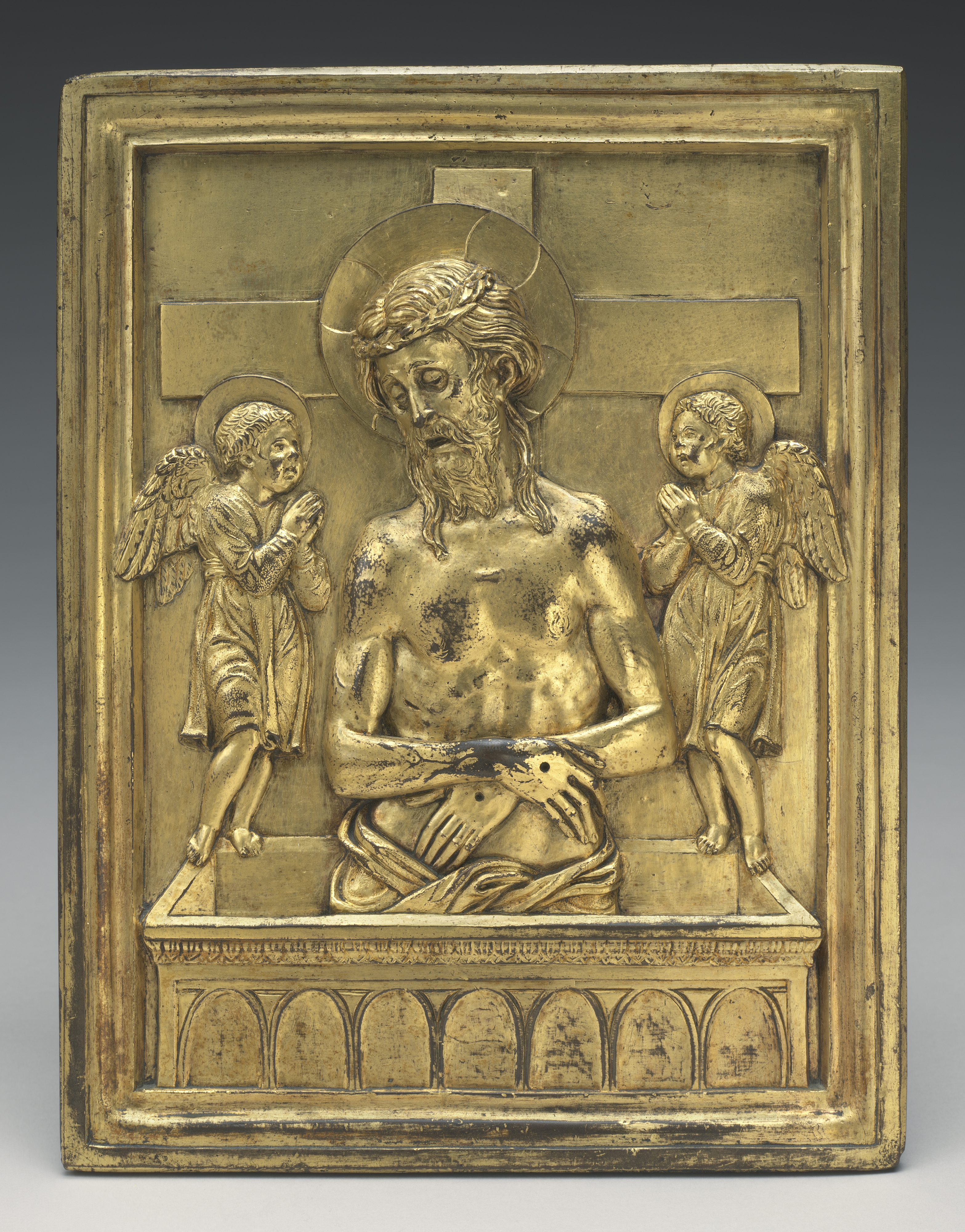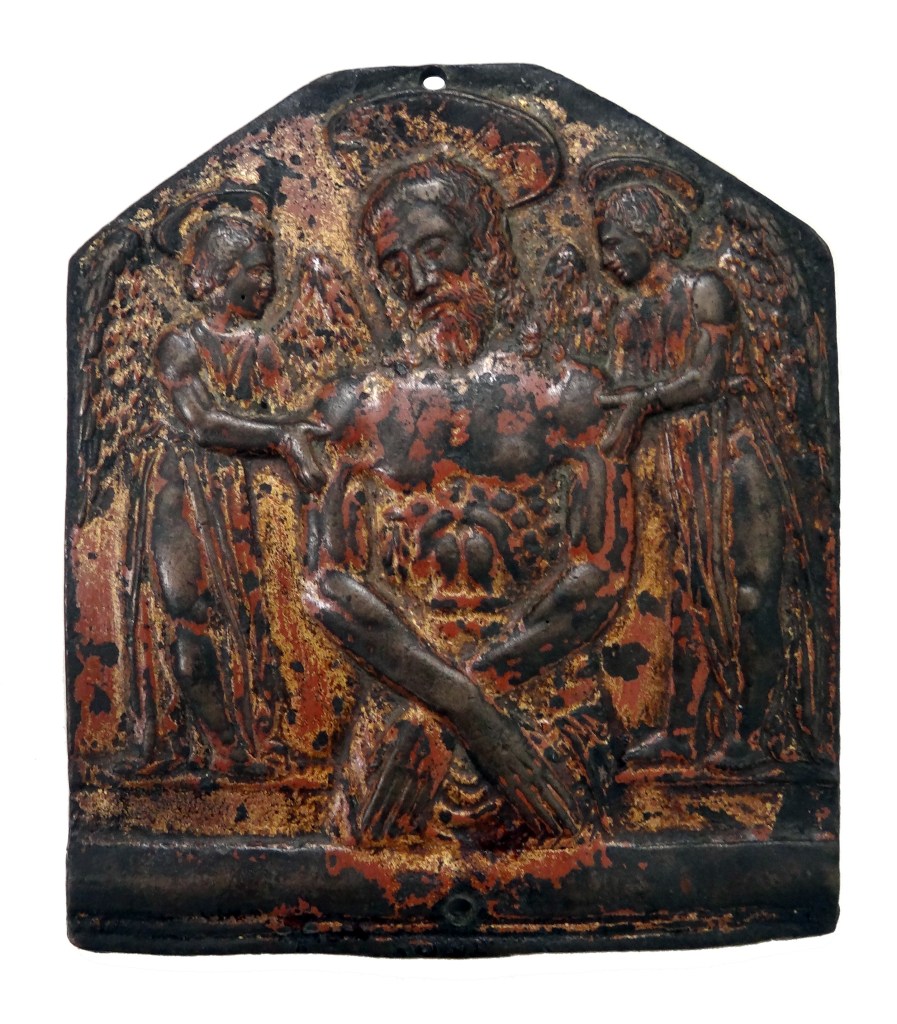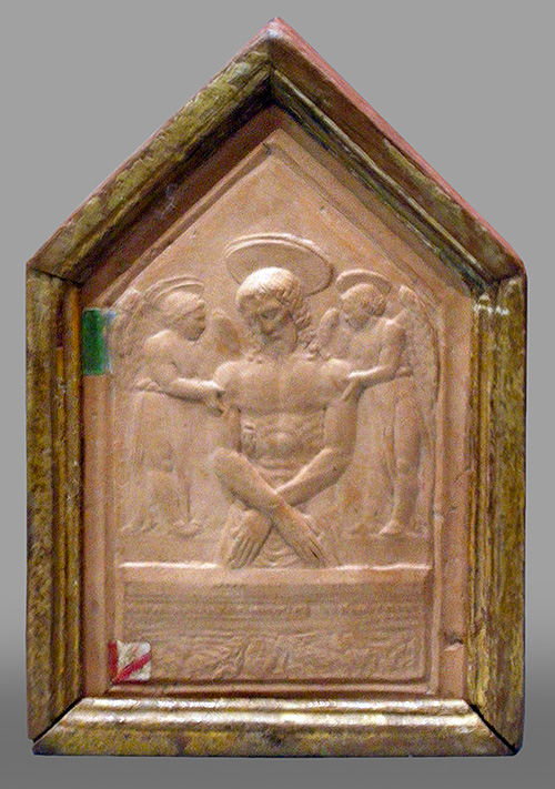 The Christ in the Tomb motif loosely imitates Donatello’s Dead Christ for the High Altar of the Basilica of St. Anthony in Padua, but the angels have more in common with the austere attendant angels depicted on a relief of the Virgin and Child with Four Angels attributed to Luca Della Robbia from the 1420s-1440s[xlviii] (Bode Museum inv. 136) or the various attendant angels depicted in the panel reliefs of the bronze doors for the New Sacristy of the Florence Cathedral made collaboratively between 1446-1475 by Luca Della Robbia, Michelozzo and Maso di Bartolomeo.