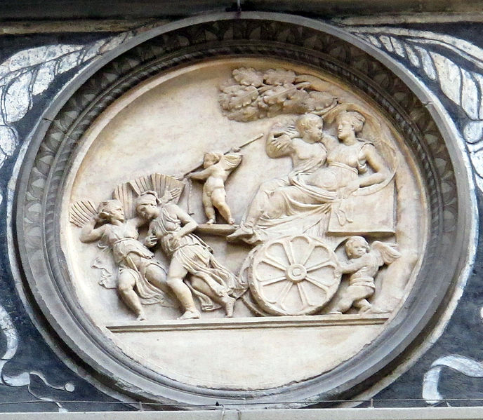The Eros, lacking a definite antique source, points to the author of the Platonic Youth’s originality through the employ of a classical theme reflective of the subject’s characteristic virtue. A similar creative impulse can be observed on Donatello’s low-relief Triumph of Pride, featured on Goliath’s helmet at the feet of his David (fig. 16) [lv]. By the mid-1450s Donatello’s workshop was acquainted with the motif as it appears reproduced in larger form as one of the tondi attributed to Donatello’s assistants responsible for the friezes of the inner courtyard at the Palazzo Medici (fig. 17)[lvi].