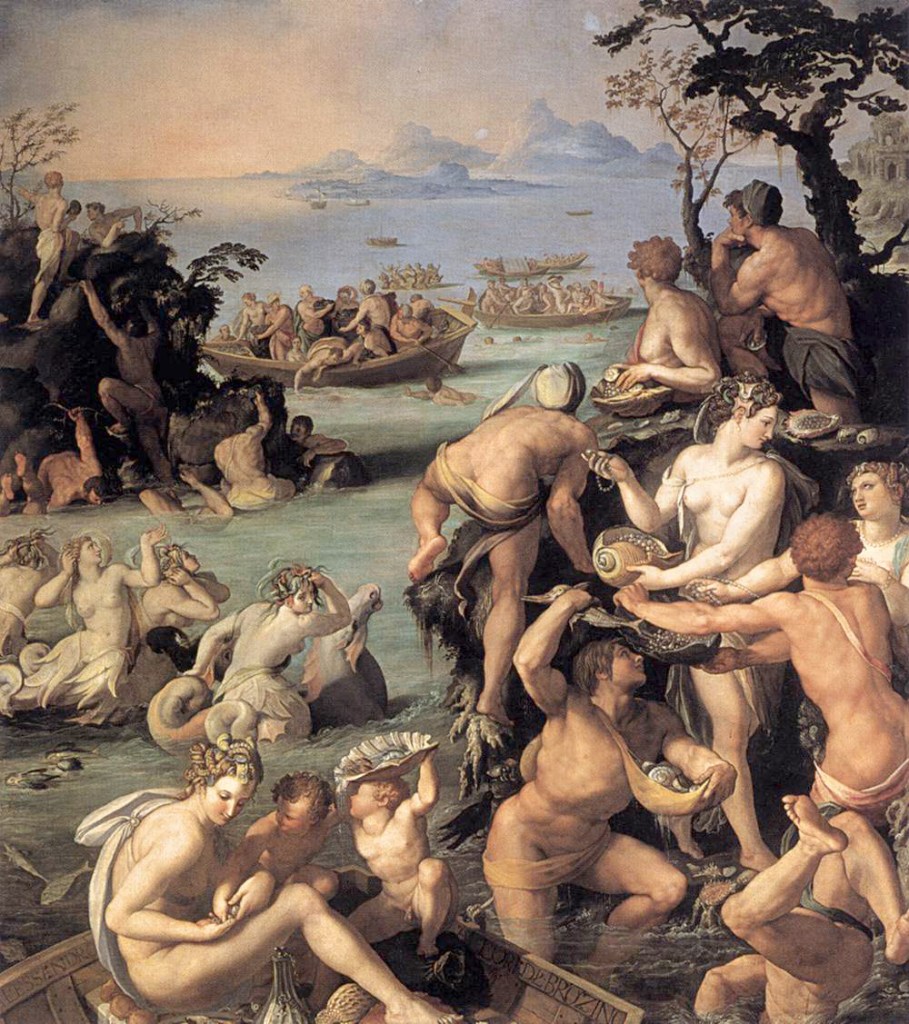 Other early pictorial examples of pearl fishing are known of the period, such as an analogous representation, more practical than fanciful, observed in a woodcut featured in Girolamo Benzoni’s Historia del mondo nuovo, published in Venice in 1565—reinterpreted by Theodor de Bry in 1594 (fig. 04)—and another much cruder depiction, albeit analogous in its portrayal of flanking cliffs, featured on a woodcut in Gonzalo Fernández de Oviedo y Valdés’ Historia general de las Indias of 1535.[xiii] Following Allori’s fantastic treatment of the subject is Jacopo Zucchi who would subsequently paint his Coral Fishery composition for Francesco’s brother, Cardinal Ferdinando de’ Medici’s studiolo at the Palazzo Firenze.[xiv]