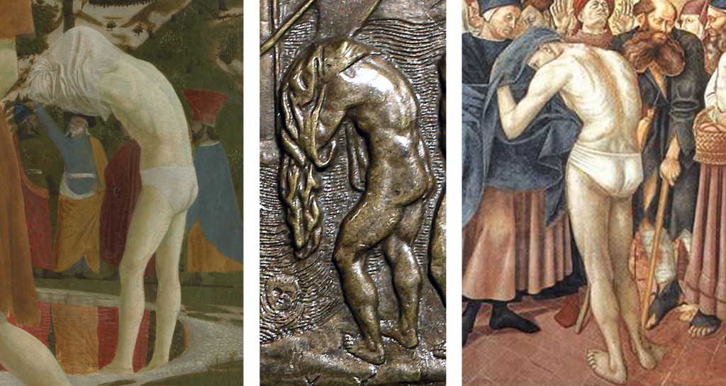 Pietro Cannata has also pointed out that the central figure of the plaquette appears to reference the neophyte in the background of Piero della Francesca’s Baptism of Christ, ca. 1448-50, executed for the Tuscan Monastery of Sansepolcro (fig. 05, left).[xxvi] However, the present author observes a slightly earlier fresco painting by Domenico di Bartolo at the hospital Santa Maria Nuova in Siena that reproduces a similar motif (fig. 05, right). It is to be wondered if the two painters could have been familiar with the same motif, circulated through drawings and sketches during the 1440s. It would appear Caradosso more likely borrowed from the Siena painting, evident in the articulate positioning of the protagonist’s feet in the composition.