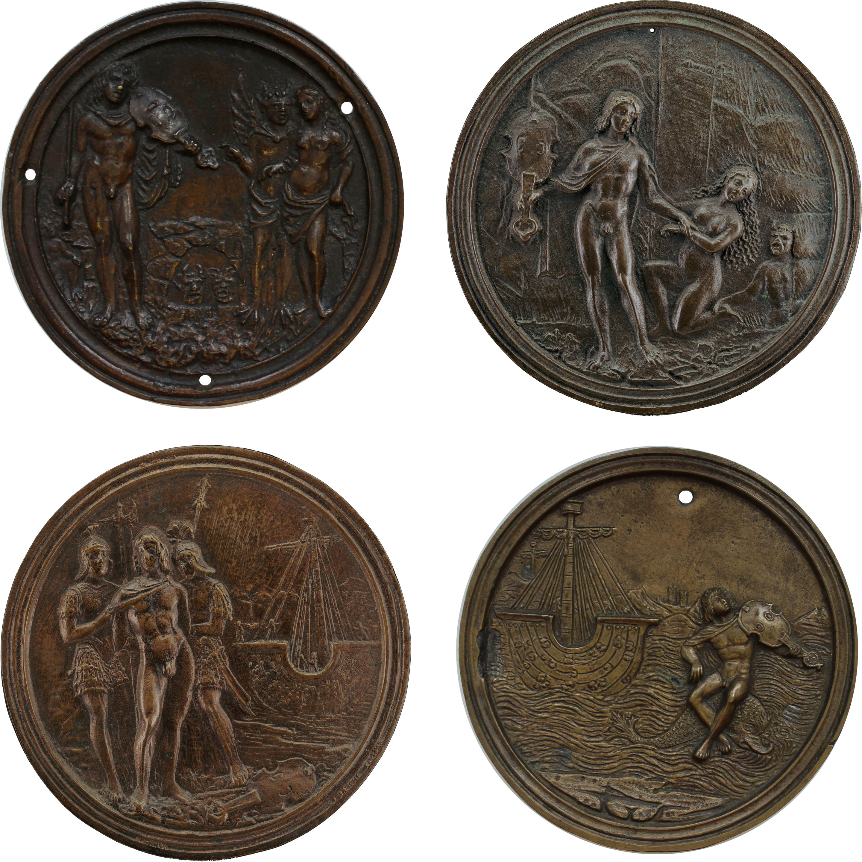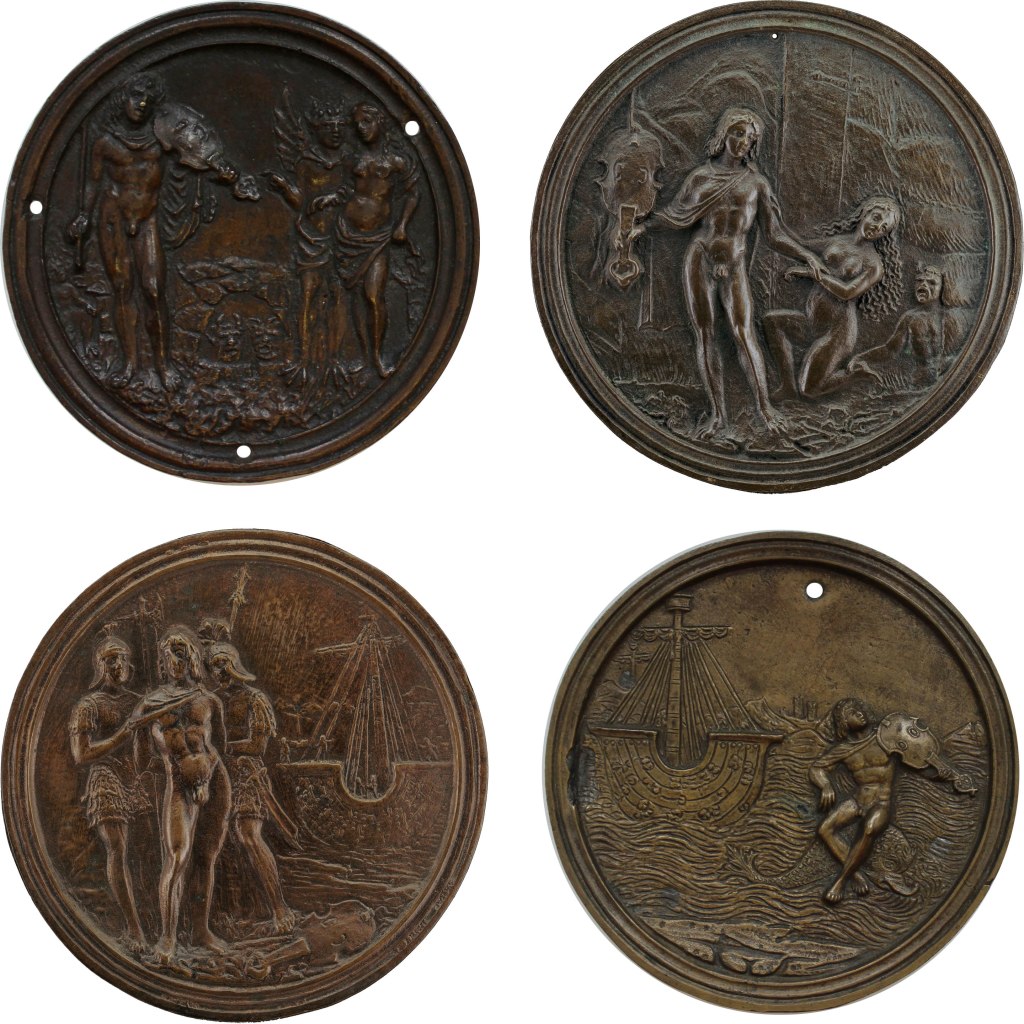 Fig. 02 – Bronze plaquette of Orpheus Redeeming Eurydice (top-left; British Museum, inv. 1915,1216.15); Bronze plaquette of Orpheus Losing Eurydice (top-right; National Gallery of Art, DC, inv. 1957.14.332); Bronze plaquette of Arion Capturing by Pirates (bottom-left; National Gallery of Art, DC, inv. 1957.14.328); Bronze plaquette of Arion Rescued by the Dolphin (bottom-right; British Museum, inv. 1915,1216.4); herewith all possibly by Matteo del Nassaro at the workshop of Moderno, ca. 1514-18, Milan, Italy (?)
