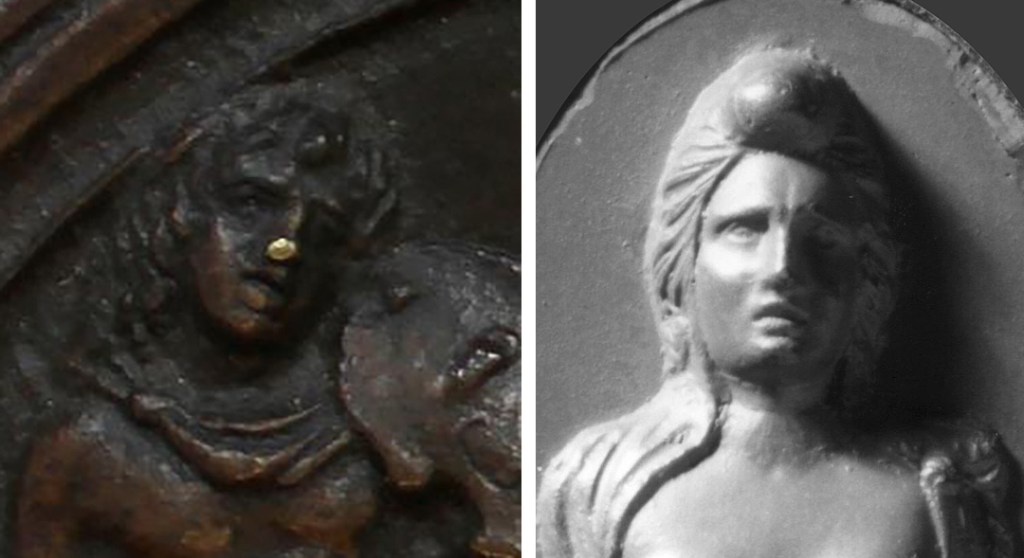 Fig. 03 – Enlarged detail of a bronze plaquette of Orpheus Redeeming Eurydice possibly by Matteo del Nassaro, ca. 1513-18, Milan, Italy (?)(left; British Museum, inv. 1915,1216.15); James Tassie plaster impression , after a jacinth, gold and ruby cameo of Cleopatra (right; Tassie impression: Beazley Archives 12472; original from the Beverley Collection at Alnwick Castle, inv. K8)