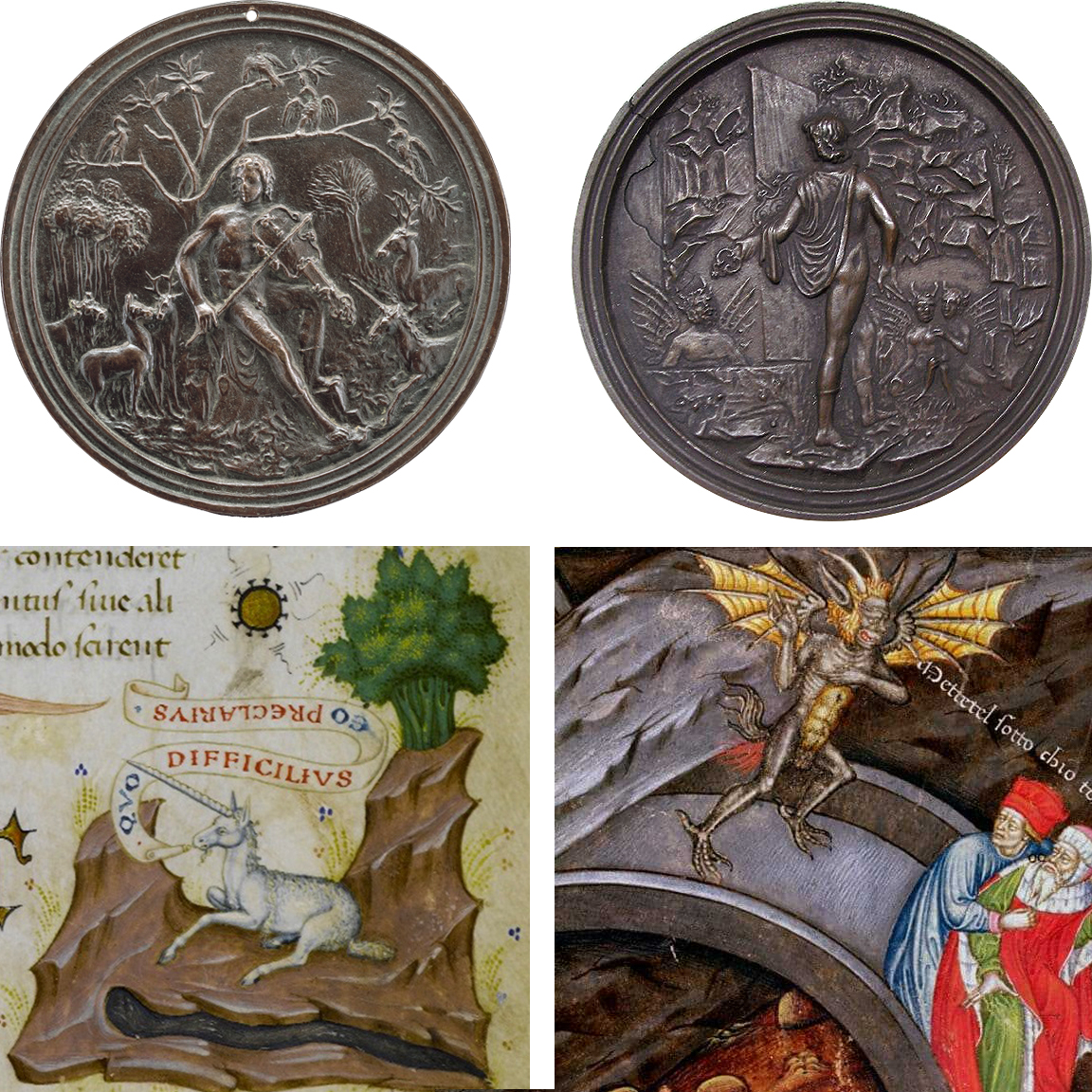 Fig. 04 – Bronze plaquette of Orpheus Playing to the Animals and Trees (top-left; National Gallery of Art, DC, inv. 1942.9.248); Bronze plaquette of Orpheus Descending into Hades (top-right; Palazzo Madama, inv. 1173), herewith possibly by Matteo del Nassaro at the workshop of Moderno, ca. 1514-18, Milan, Italy (?); detail of the frontispiece from Suetonius’ Lives of the Twelve Caesars by the Master of the Vitae Imperatorum, 1444 (bottom-left; Archivio Storico Civico e Biblioteca Trivulziana Cod Triv 696, fol. 1); detail of Dante’s Inferno by the Master of the Vitae Imperatorum, ca. 1430-50 (bottom-right; Bibliotheque Nationale, Paris)