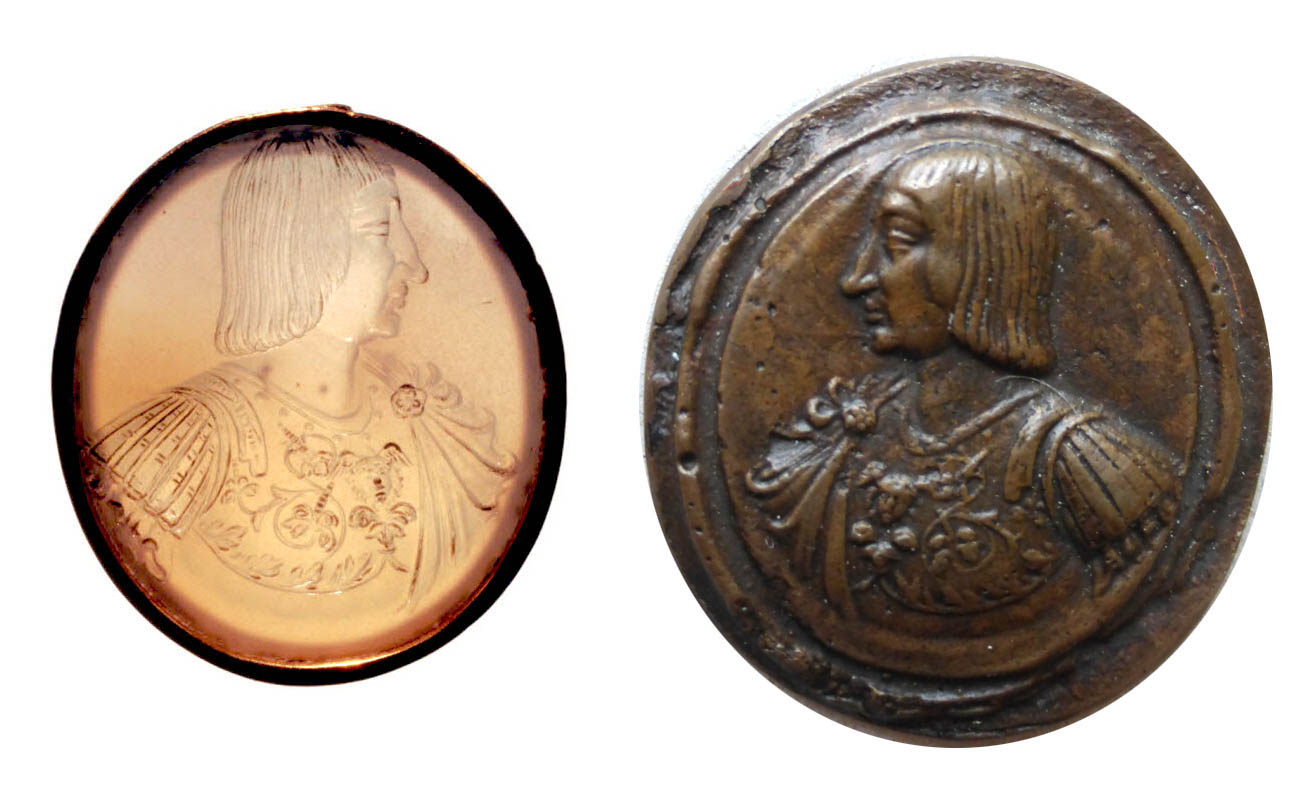 Fig. 06 – Chalcedony intaglio of King Francis I attributed to Matteo del Nassaro, 1515-16, Milan Italy (?) (left; Cabinet des médailles at the Bibliotheque Nationale, Paris, inv. 58.2485); Bronze plaquette cast after the aforenoted intaglio (right; Ubertazzi collection)