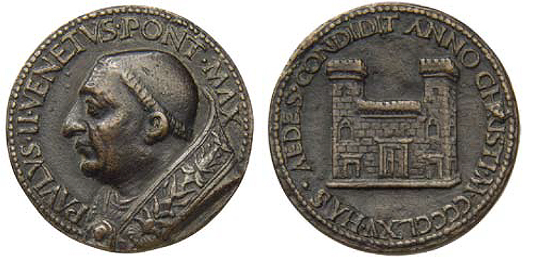 Fig. 1: Bronze portrait medal of Pope Paul II (obverse), attributed to Cristoforo di Geremia, 1465, with the facade of the Palazzo di San Marco (reverse) (Münzkabinett, Dresden, Germany)