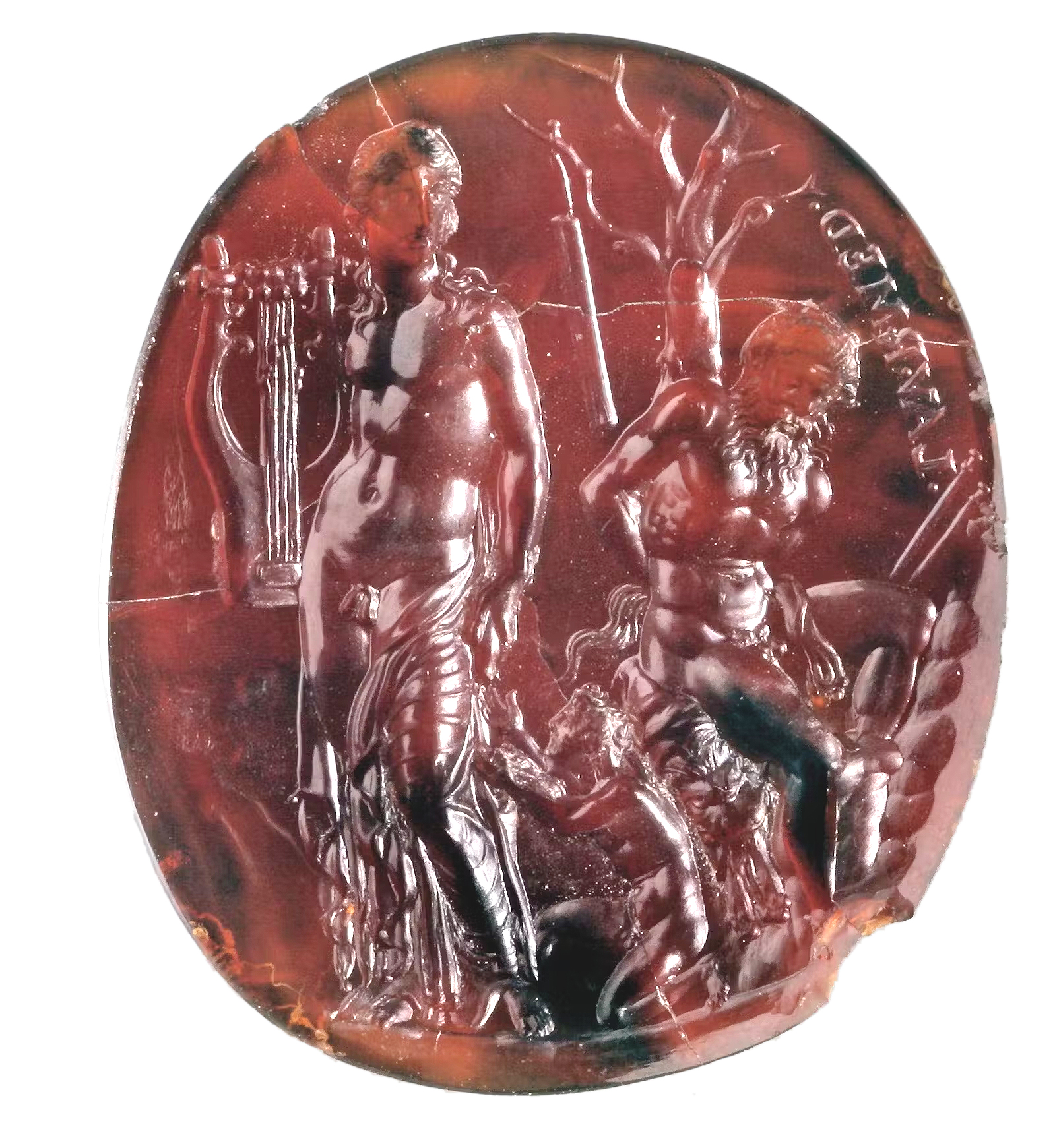 Fig. 3: Carnelian intaglio of Apollo, Marsyas and Olympus, often called the ‘Seal of Nero’ (Museo Archeologico Nazionale di Napoli, inv. 26051)