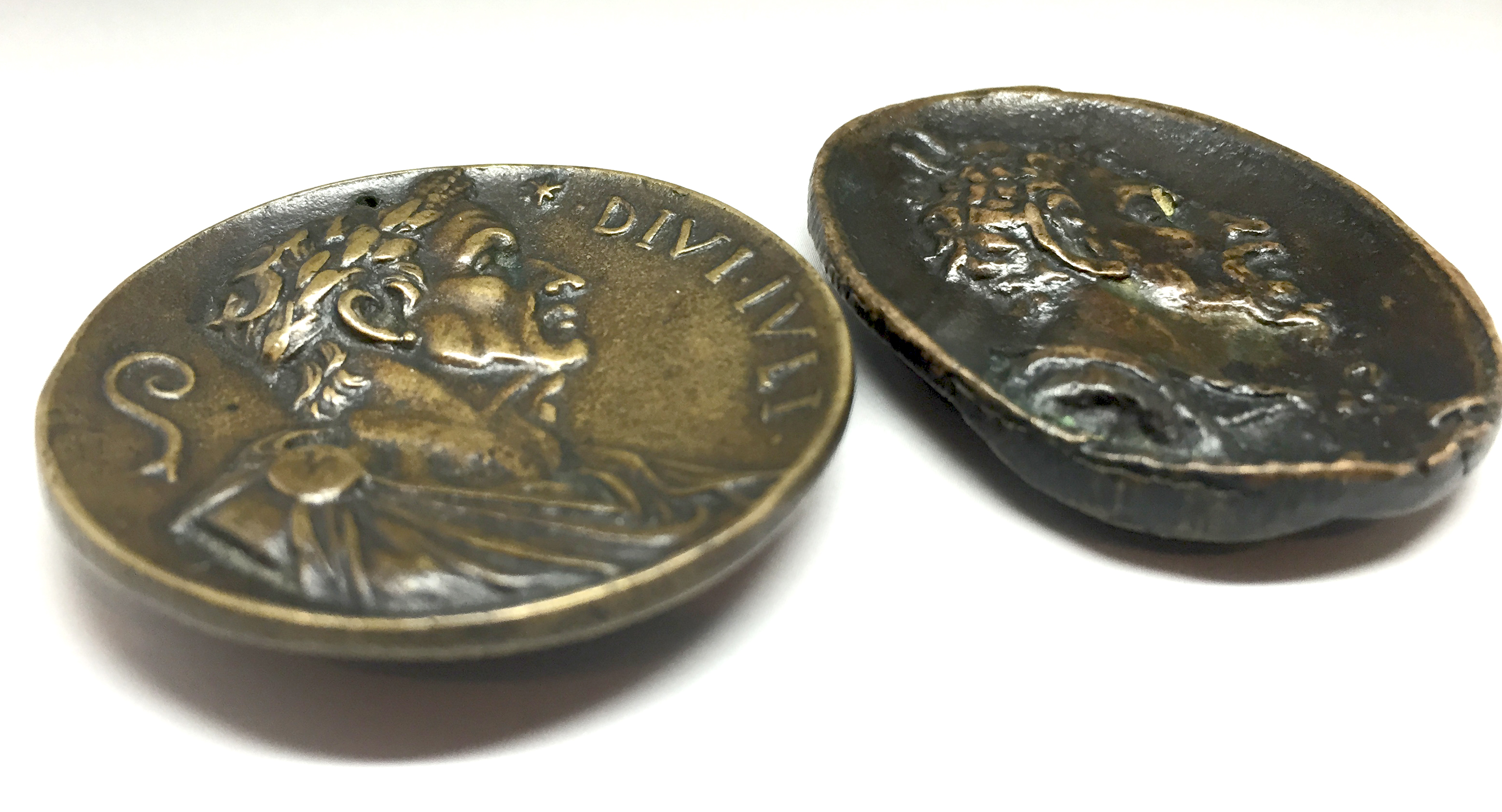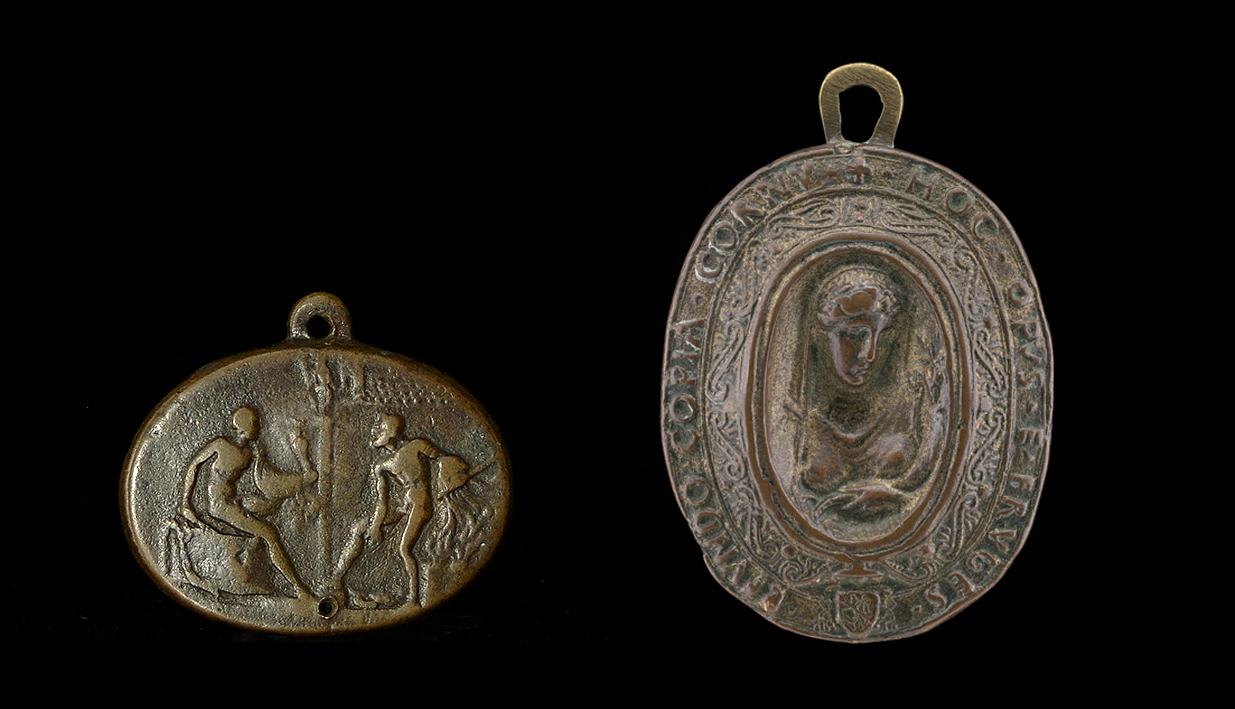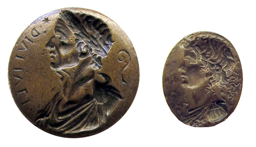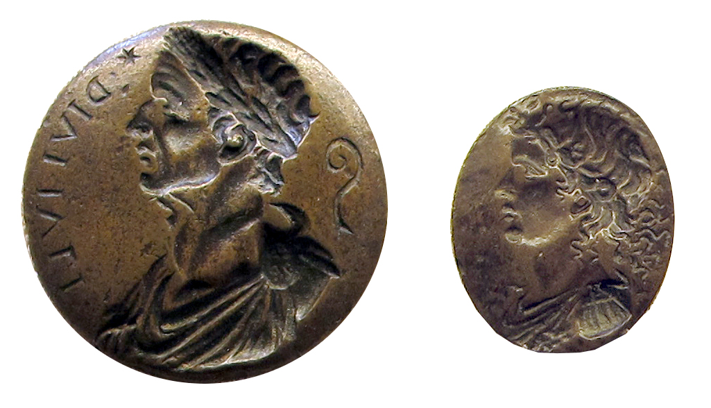 Fig. 15: Bronze plaquette matrices of Julius Caesar (left) and a Bust of a Classical Youth (right) used for stamping leather bindings for book covers (Museo Nazionale del Bargello, invs. 621B and 153B)