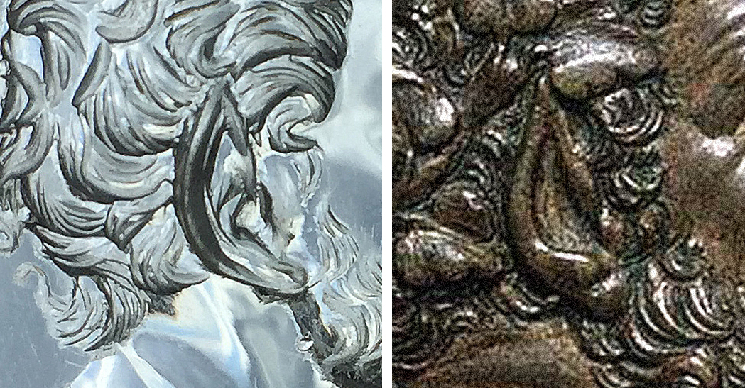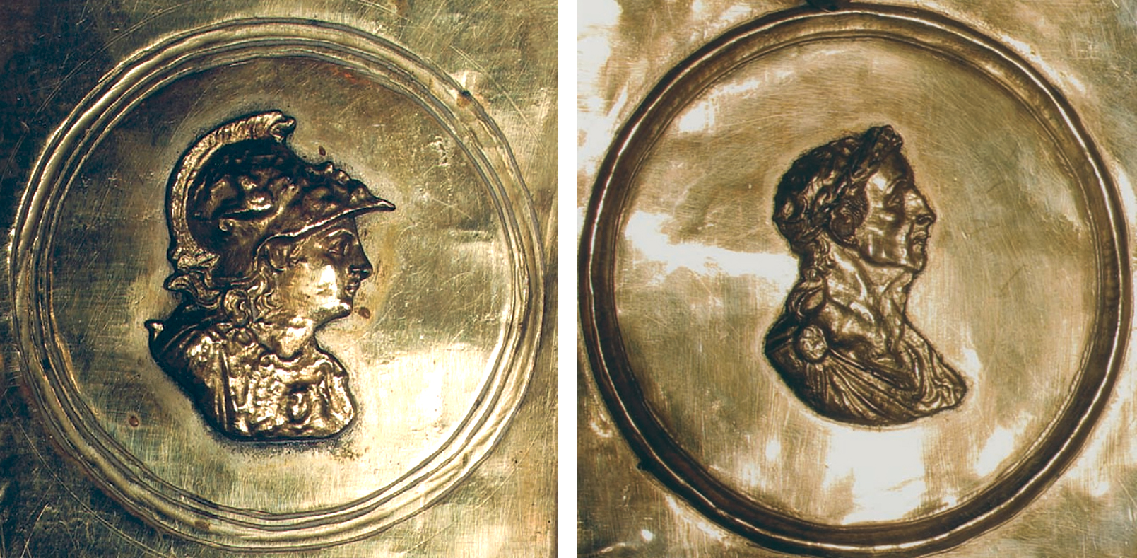 Fig. 5: Details of the gilt silver interior lining of the Shrine of St. Simeon in Zadar by Tommaso di Martino of Zara, 1497, reproducing plaquettes of a Head of Minerva (left) and Julius Caesar (right) (Church of St. Simeon, Zadar, Croatia)