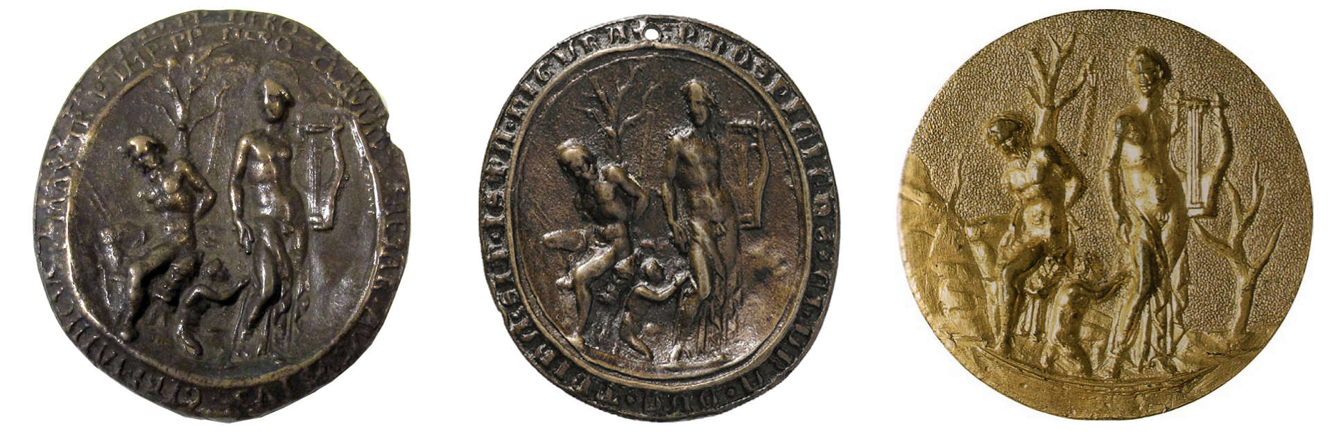 Fig. 6: Bronze plaquette of the ‘Seal of Nero,’ probably cast in Rome after a wax seal impression before 1465 (left; Cabinet des Medailles, Bibliothèque Nationale, inv. 442); bronze plaquette after a carnelian of Apollo, Marsyas, and Olympus with later mount, cast probably in 1468 (center; Mario Scaglia collection); gilt bronze medallic reverse of a medal, based upon the ‘Seal of Nero,’ by Cristoforo Geremia, 1468, Rome (right; Palazzo Venezia)