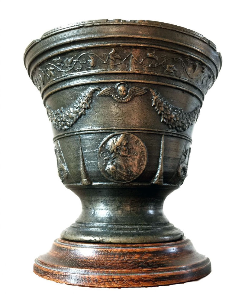 Fig. 12: Bronze mortar with later wooden base, reproducing a plaquette of Julius Caesar, France, 17th century (private collection)