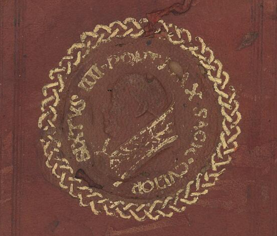 Fig. 14: Stamped leather bookbinding of St. John Chrysostom’s sermons, probably bound by Bartolomeo Sanvito, ca. 1475-78, after a portrait medal of Pope Sixtus IV made by Hermes Flavius di Bonus in 1473 (Vatican Library, vat. lat. 3575)