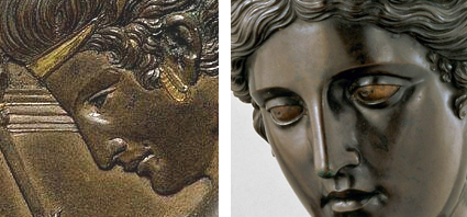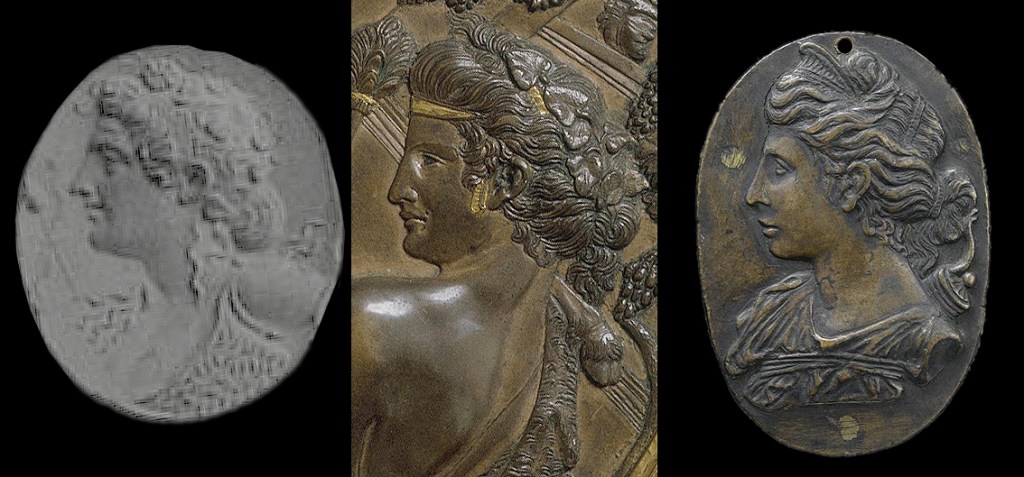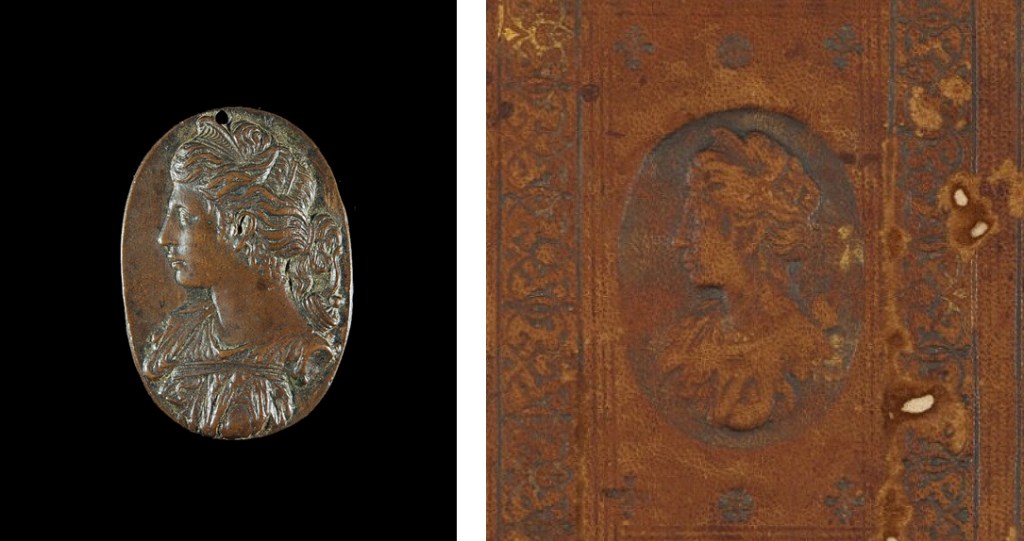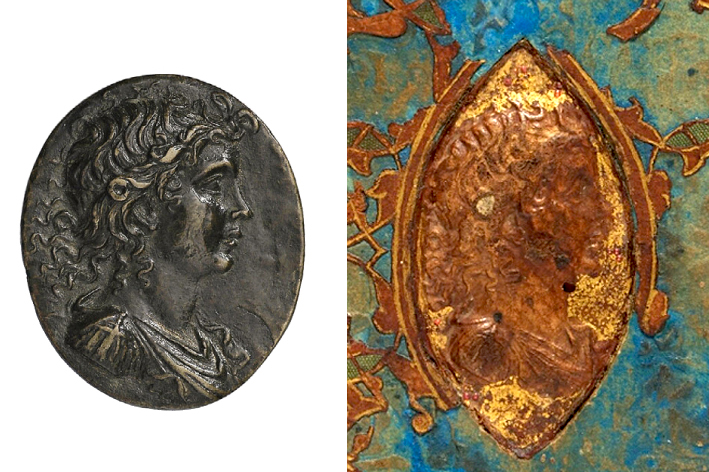 Fig. 16: Bronze plaquette Bust of a Classical Youth (Antoninus or Caracalla?), after a gem here attributed to Giuliano di Scipio, before 1471 (left; Mario Scaglia collection); and a detail of the cover binding of the Codex Lippomano, reproducing a Bust of a Classical Youth (right; Morgan Library, inv.199044)