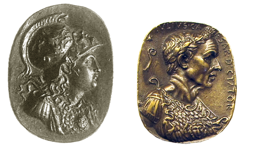 Another early production could involve bronze plaquette copies of another prized gem: Paul II’s sardonyx cameo of Odysseus and Diomedes with the Palladium, signed by a certain Felix, and later dubbed the ‘Felix Gem.’26 The impression of the gem’s composition is weakly reproduced on these plaquettes and could infer an early experimentation in reproducing the most precious objects from his collection (fig. 4, left).27