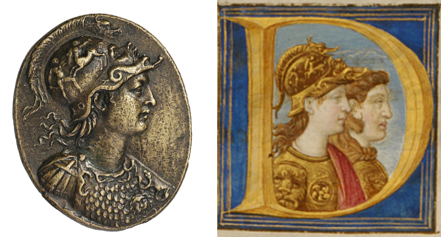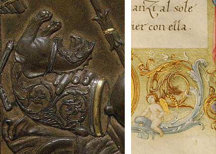 Fig. 13: Detail reproducing a plaquette of Julius Caesar on an illuminated sheet of Livy’s Decades by Giovanni Todeschino, 1494, Naples (left; US Library of Congress, inv. 2021667740); detail reproducing a plaquette of Diana on an illuminated frontispiece of De evitandis venenis… by Giovanni Todeschino, 1480s, Naples (right; Biblioteca Casanatense, Rome, Ms.125)