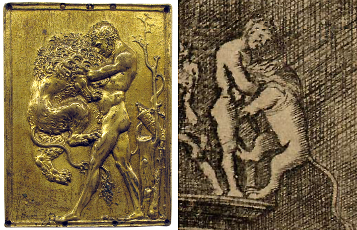 Fig. 4 – Gilt bronze plaquette of Standing Hercules and the Nemean Lion by Moderno (left; Museo Nazionale del Bargello, inv. 427); detail of a print of an Antique Sacrifice by Girolamo Mocetto, ca. 1510-30 (right; British Museum, inv. 1845,0825.593)