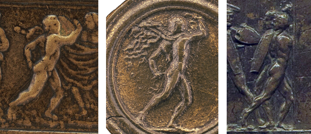 Fig. 7 – Detail of the lower register of a plaquette of the Entombment of Christ by Moderno (left; National Gallery of Art, DC, inv. 1957.14.295); detail of a plaquette of Running Hercules by Moderno (center; National Gallery of Art, DC, inv. 1996.82.2); detail of a plaquette depicting an Unidentified Military Scene or Attack on a Gate, possibly by Moderno and/or the Coriolanus Master (right; Museo Nazionale del Bargello, inv. 179B)