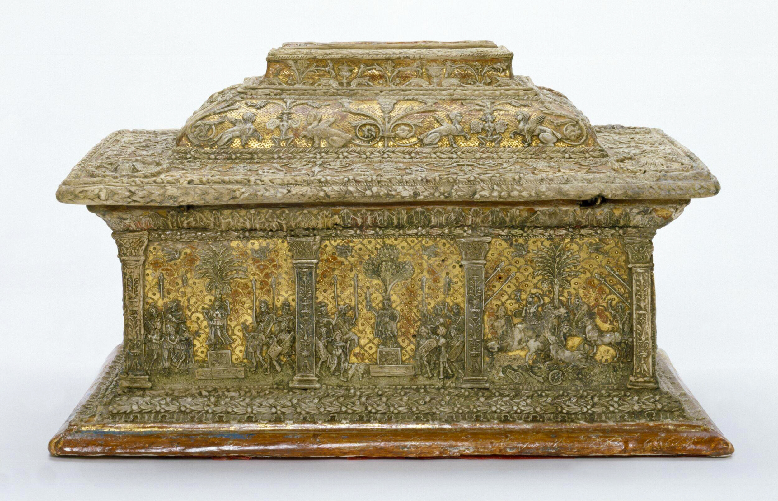 Fig. 9 – A pastiglia casket with white lead paste reliefs on a gilded ground, attributed to the Workshop of the Main Berlin Casket (Victoria & Albert Museum, inv. W.23-1953)