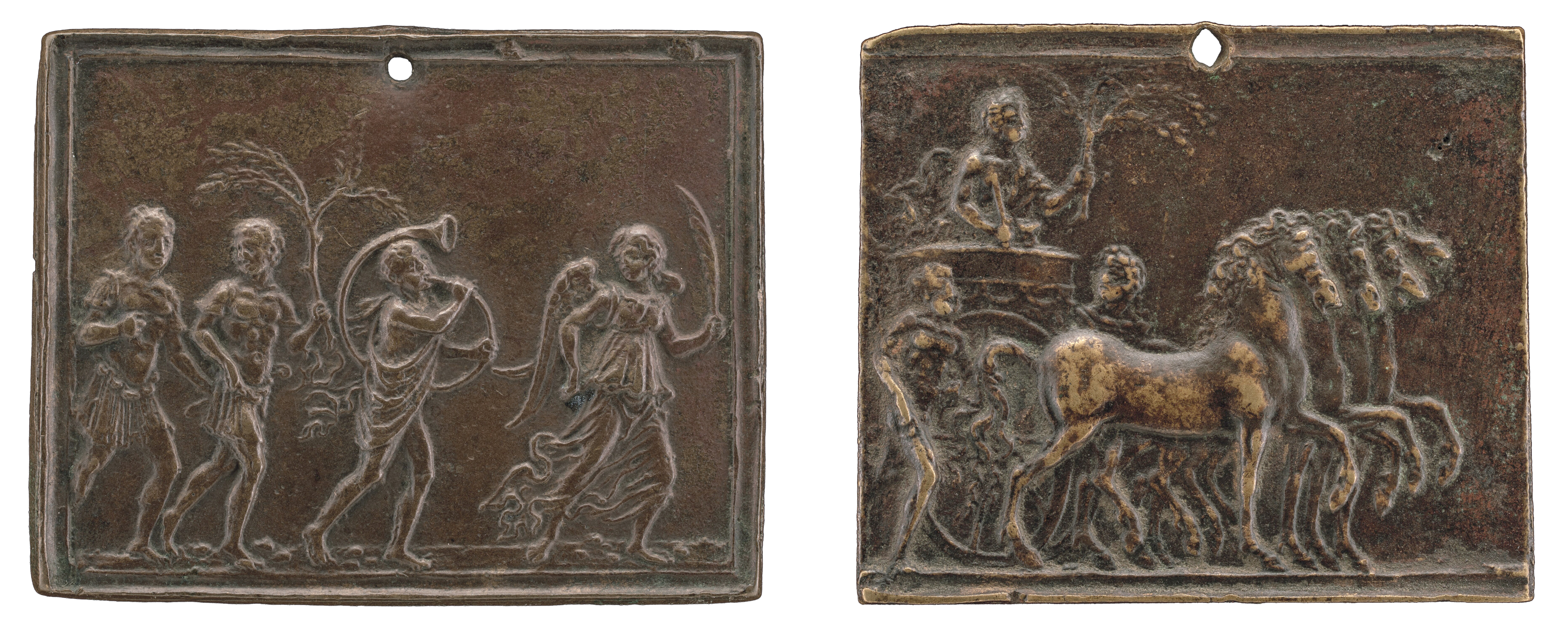 Fig. 12 – Bronze plaquette of an Allegory of Victory, here attributed to Moderno, ca. l500 (left; National Gallery of Art, DC, inv. 1957.14.270); bronze plaquette of a Roman Triumph, here attributed to Moderno, ca. late 1500 (right; National Gallery of Art, DC, inv. 1957.14.269)