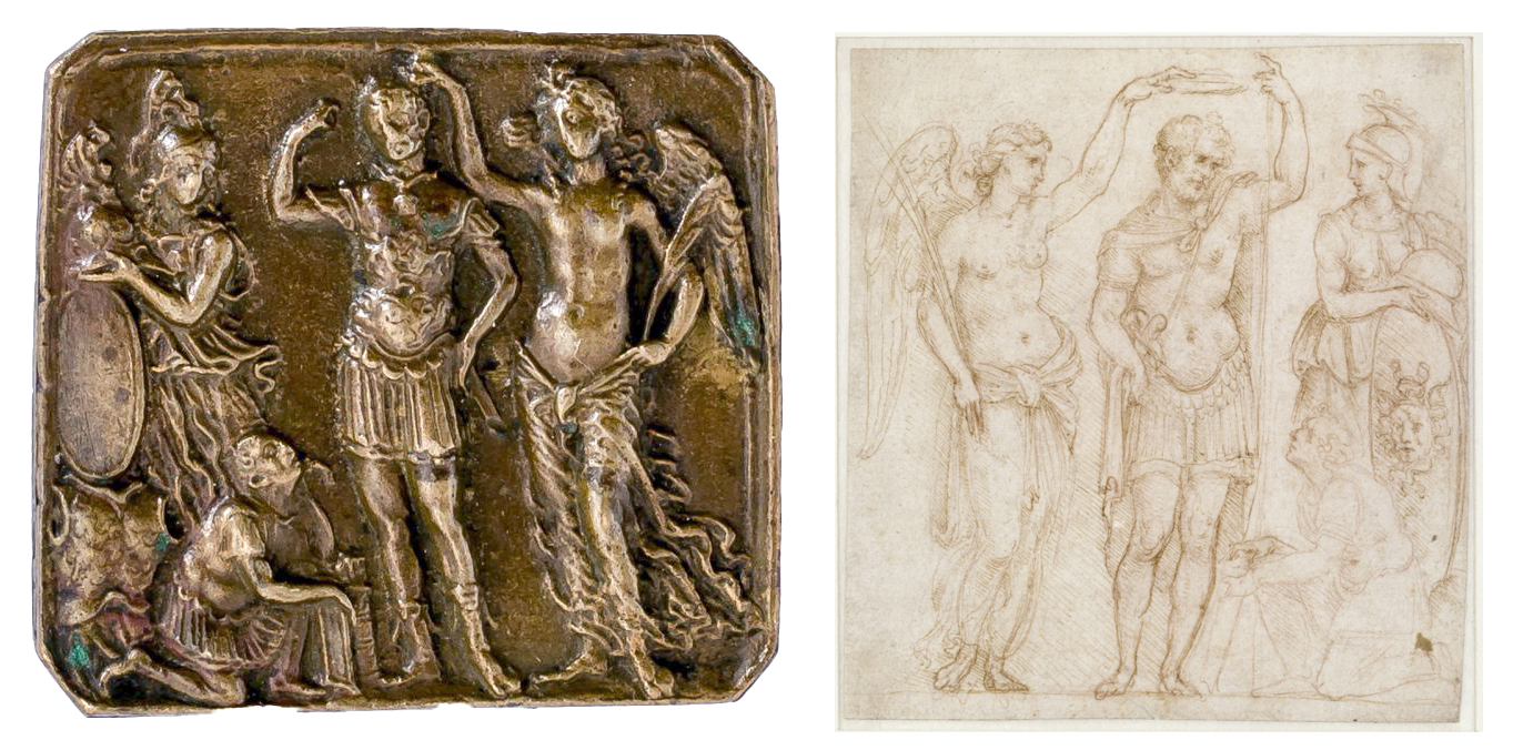 Fig. 13 – Bronze plaquette of a Roman General Crowned between Minerva and Victory by Moderno (left; private collection); pen and brown ink drawing of a Roman General Crowned between Minerva and Victory by Cesare da Sesto, 1508-ca. 1510 (right; Kupferstichkabinett, Staatliche Museen, Berlin, inv. KdZ 5199)