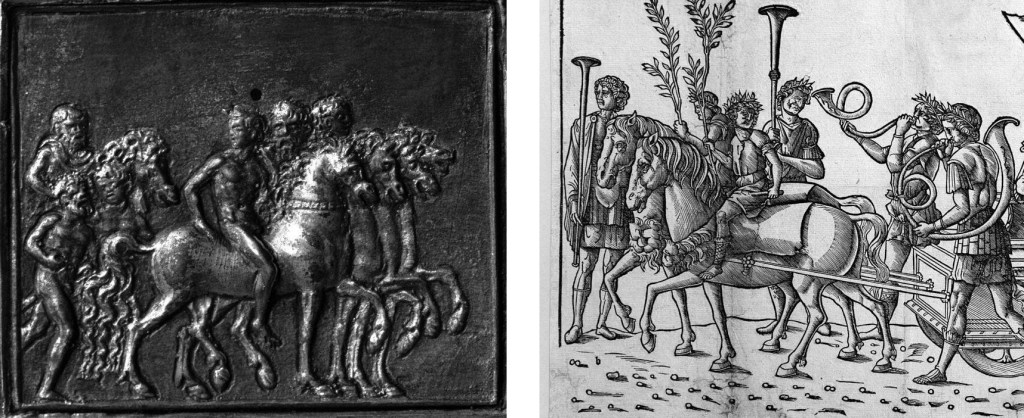 Fig. 14 – Gilded and silvered bronze plaquette of Coriolanus Leaving Rome, after Moderno, from an inkwell attributed to the Coriolanus Master, ca. 1500, Italy (left; Victoria & Albert Museum, inv. M.167-1921); detail of a woodcut print of a Roman Triumph, after Benedetto Bordone, 1504 (right; Kupferstichkabinett, Staatliche Museen, Berlin, inv. 346)