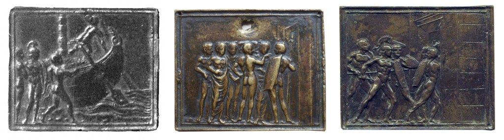 Fig. 15 – A suite of bronze plaquettes possibly by Moderno and/or the Coriolanus Master of an Unidentified Naval Scene or Agamemnon’s departure for Troy (?) (left; Museo Civico Belluno); a scene of Agamemnon Demanding Tribute from Troy (?) (center; collection of Sandro Ubertazzi); and an Unidentified Military Scene or Agamemnon Sacking Troy (?) (right; Museo Nazionale del Bargello, inv. 179B)
