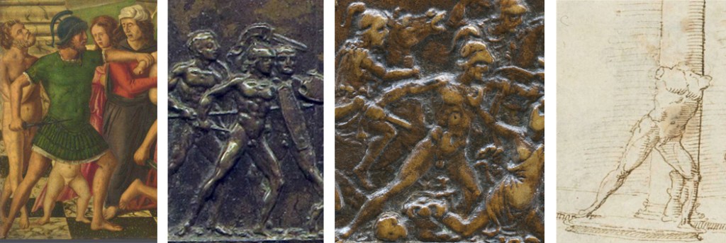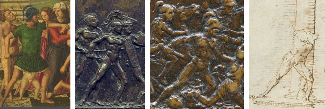 Fig. 17 – From left-to-right: detail of the Massacre of the Innocents, oil on panel by Girolamo Mocetto, ca. 1500-25 (National Gallery, London, inv. NG1240); detail of a bronze plaquette of an Unidentified Military Scene or Agamemnon Sacking Troy (?) by Moderno and/or the Coriolanus Master (Museo Nazionale del Bargello, inv. 179B); detail of a medal reverse with a Battle Scene by Antico, ca. 1500-02 (National Gallery of Art, DC, inv. 1957.14.666.b); detail of a pen and grey ink sketch of the Garden Hall of the Palazzo Medici-Madama with Antique Sculptures by Maarten van Heemskerck, ca. 1532-37 (Kupferstichkabinett, Staatliche Museen, Berlin, inv. 79 D a, fol. 48r)