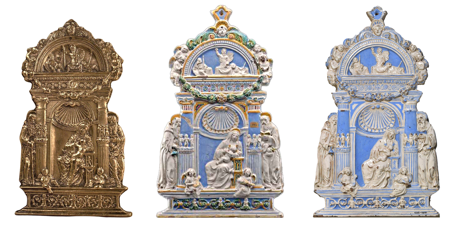 Fig 1: A gilt bronze pax of the Virgin and Child, formerly in the collection of the Baron of Monville (Thomas Charles Gaston), by Moderno and probably cast by Moderno & Associated Makers, ca. 1528-35 (image courtesy De Gurbert Antiques, France; left); a colored maiolica pax of the Virgin and Child, after Moderno (Museo Civico di Modena, inv. 1437; center); a blue and cream maiolica pax of the Virgin and Child, after Moderno (Victoria & Albert Museum, inv. 635-1891; right)