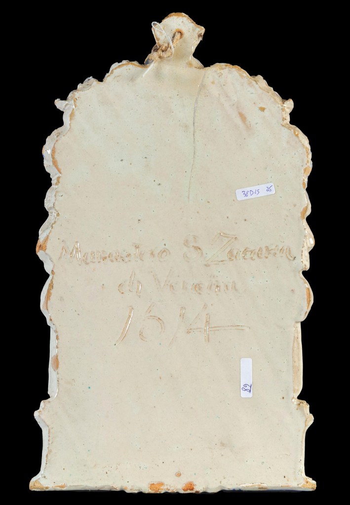 Another pax depicting the Institution of the Rosary, previously mentioned, is scarcely noted in literature, and is also reproduced by this same maiolica workshop (fig. 4). The reverse of the maiolica pax features a similar inscription: Monastero S. Zacaria / di Venezia / 1614, referring to the Church of San Zaccaria in Venice (fig. 3). In lieu of what would otherwise be an empty blank ground on the lower surface of the relief, a coat-of-arms has been painted by the maiolica artist involved in its production and may possibly reference the Contarini family crest, one of the founding families of Venice.
