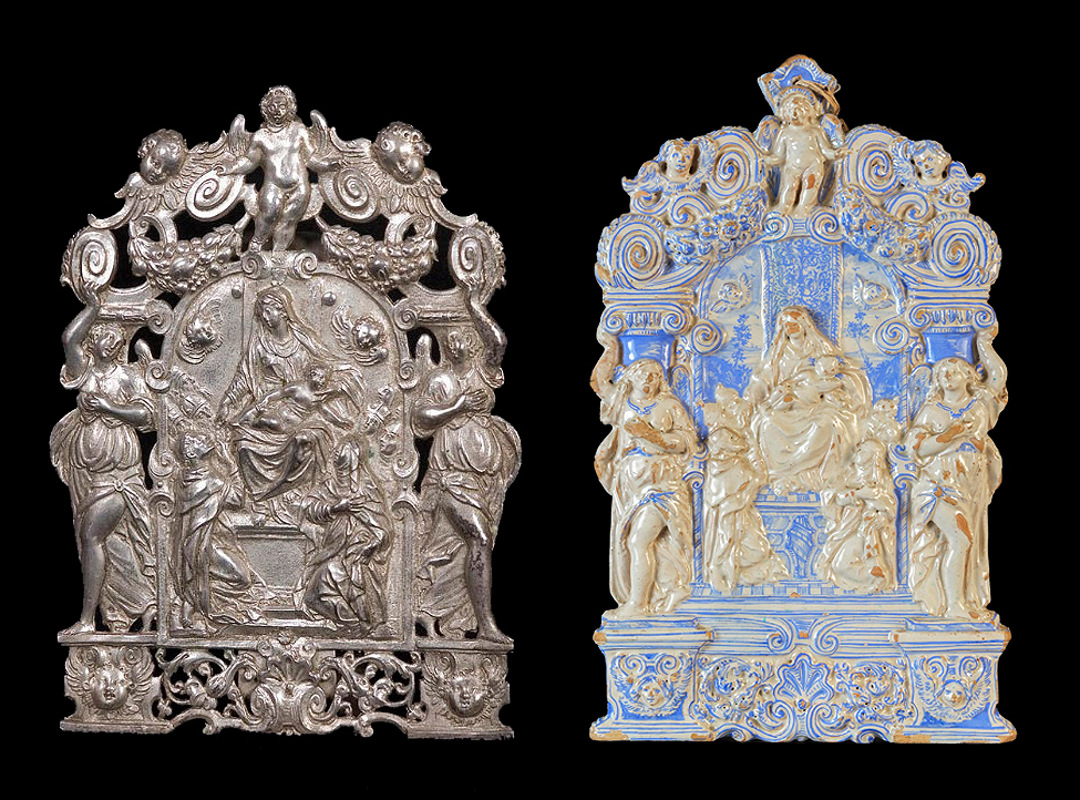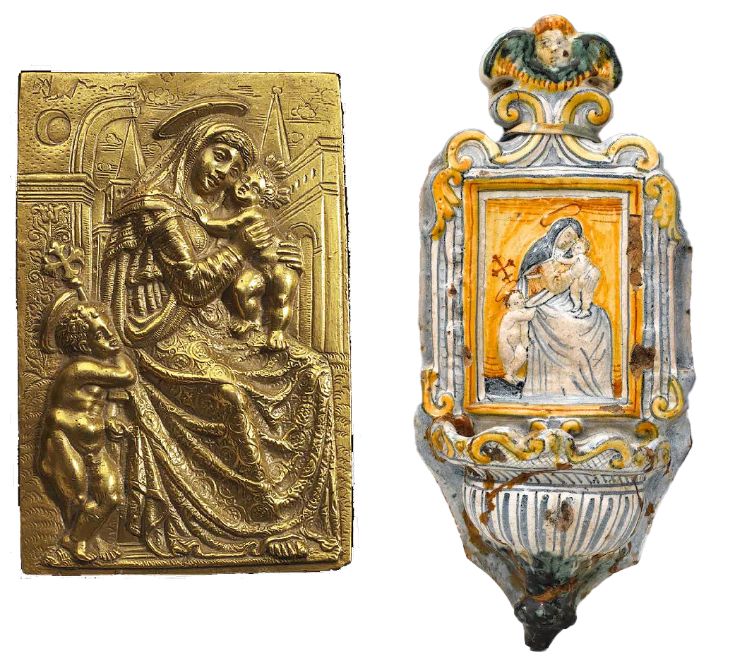 Fig 8: Bronze plaquette of the Madonna with the Infant Christ and John the Baptist (John R. Gaines collection, Morton & Eden sale, 8 December 2005; left); colored maiolica holy water stoup depicting the Madonna with the Infant Christ and John the Baptist, Deruta, 17th century (Bonhams auction, 14 May 2008, Lot 22; right).