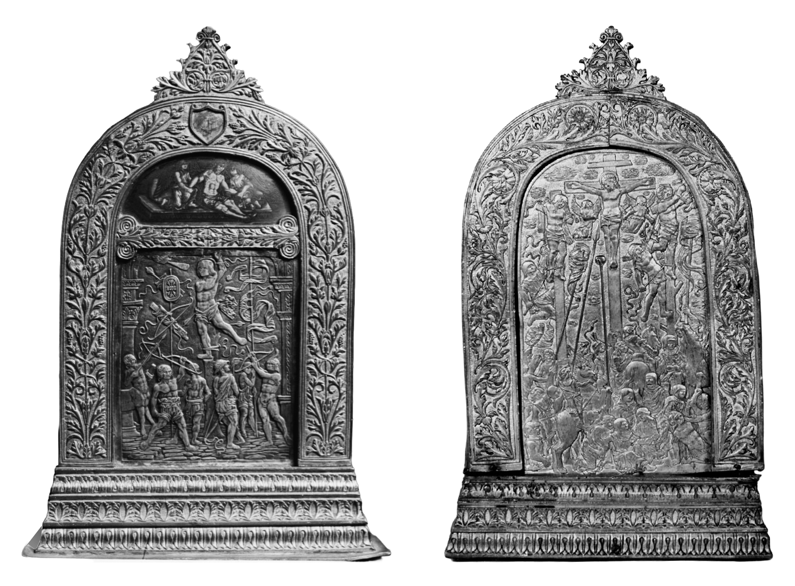 Fig. 1: Silver and parcel gilt pax depicting the Martyrdom of Saint Sebastian with a niello lunette of Christ at the Tomb, probably 1490s (left; Treasury of the Basilica of San Petronio, Bologna); silver and parcel gilt pax of the Crucifixion, probably 1490s (right; formerly at San Martino Maggiore, Bologna)