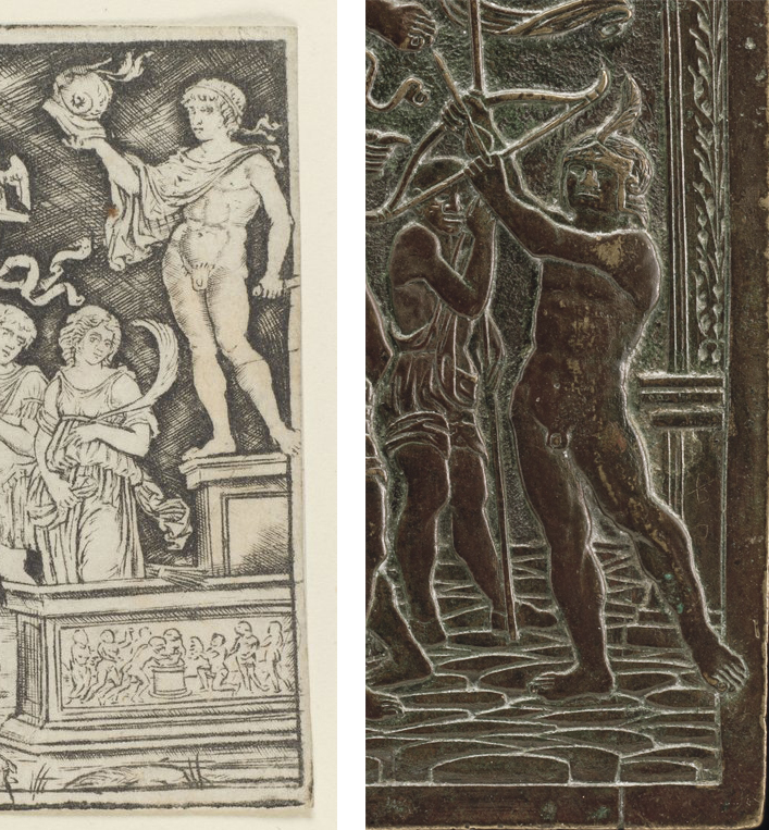 Fig. 3: Detail of A Sacrifice to Mars print in the niello manner by Peregrino da Cesena, ca. 1490-1520 (left; Louvre, inv. 52 ni); detail of figure 2 (right; NGA)