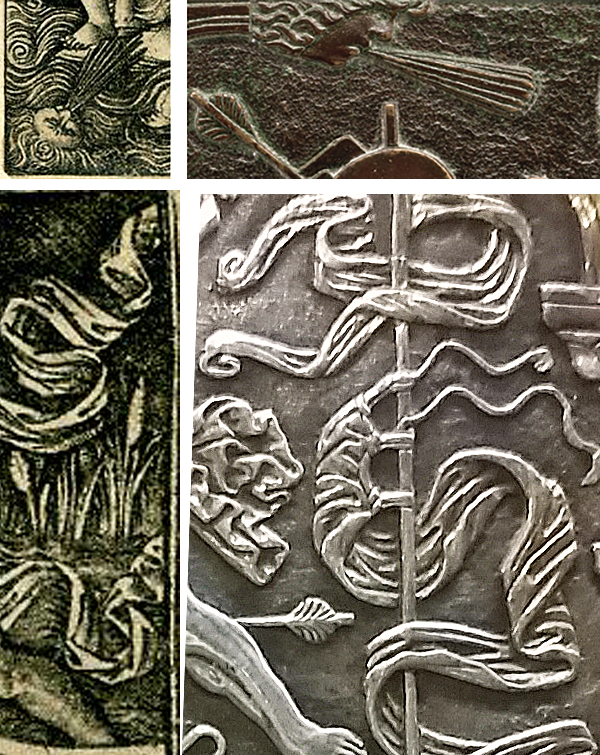 Fig. 4: Detail of an allegorical print (of Adversity?) in the niello manner by Peregrino da Cesena, ca. 1490-1520 (top left; British Museum, inv. 1895,0915.150); detail of figure 2 (top right; NGA); detail of a print of the Triumph of Neptune by Peregrino da Cesena, ca. 1490-1520 (bottom left; British Museum, inv. 1884,0726.32); detail of a silver relief of the Martyrdom of Saint Sebastian (bottom right; Treasury of the Basilica of San Petronio, Bologna)