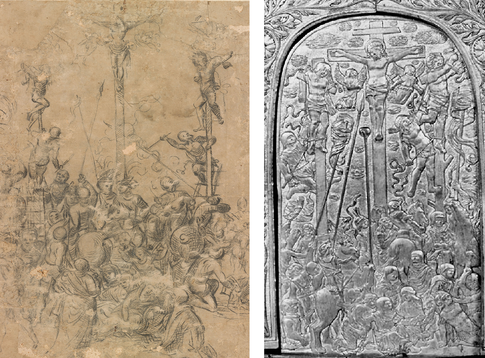 Fig. 5: Black chalk sketch of the Crucifixion attributed to Amico Aspertini, ca. 1500 (left; Morgan Library & Museum, inv. 1981.18); detail of a silver pax of the Crucifixion (right; formerly at San Martino Maggiore, Bologna)