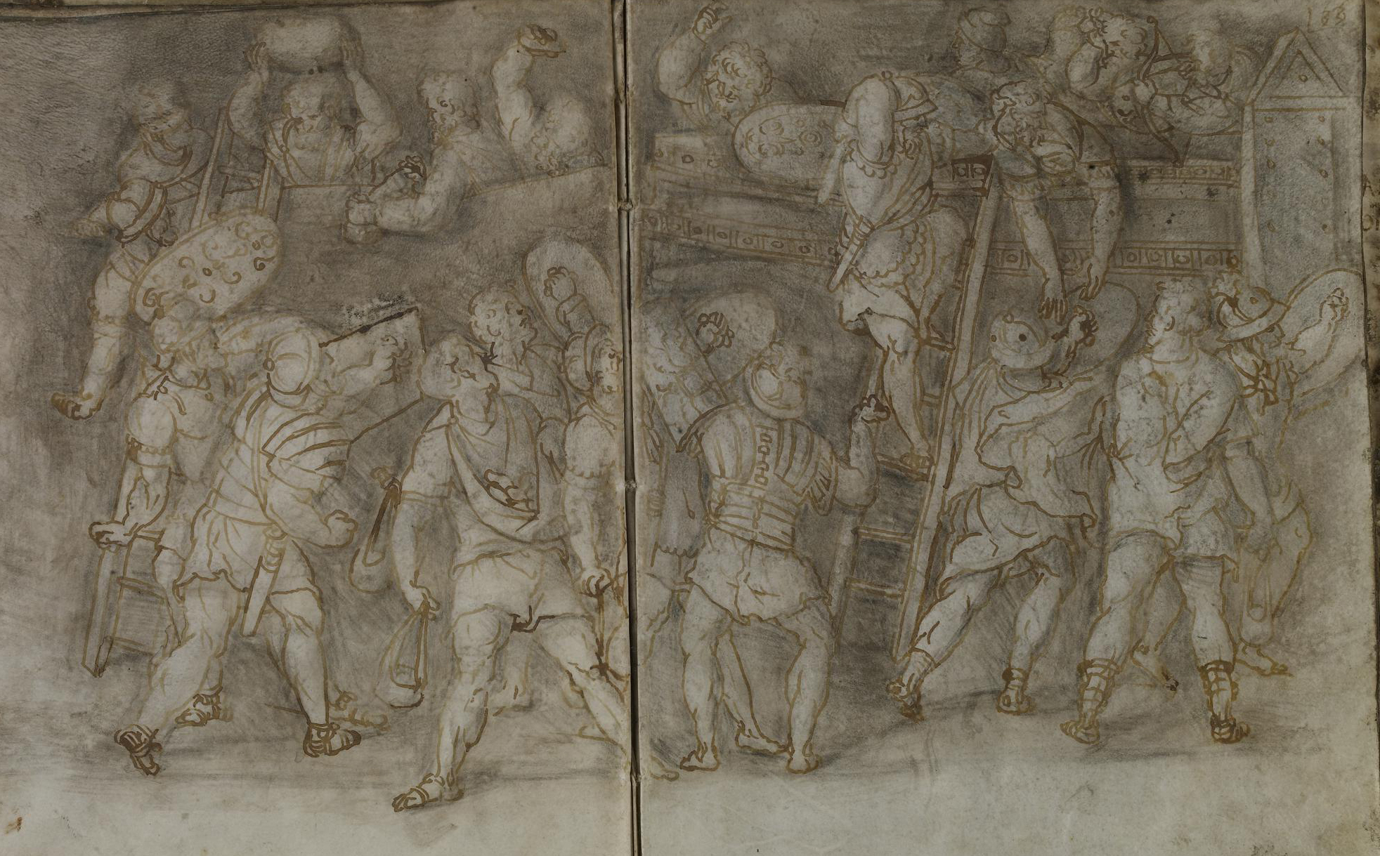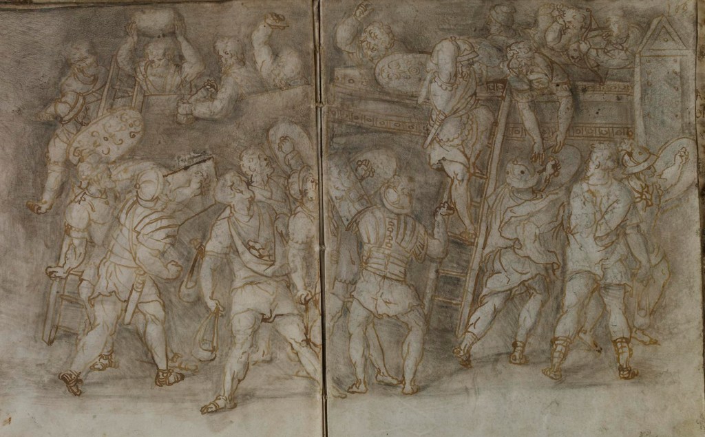 Fig. 3: Pen and brown ink over black chalk drawing of a scene from the Trajan Column from the sketchbook of Amico Aspertini, ca. 1532-35 (British Museum, inv. 1898,1123.3.32)