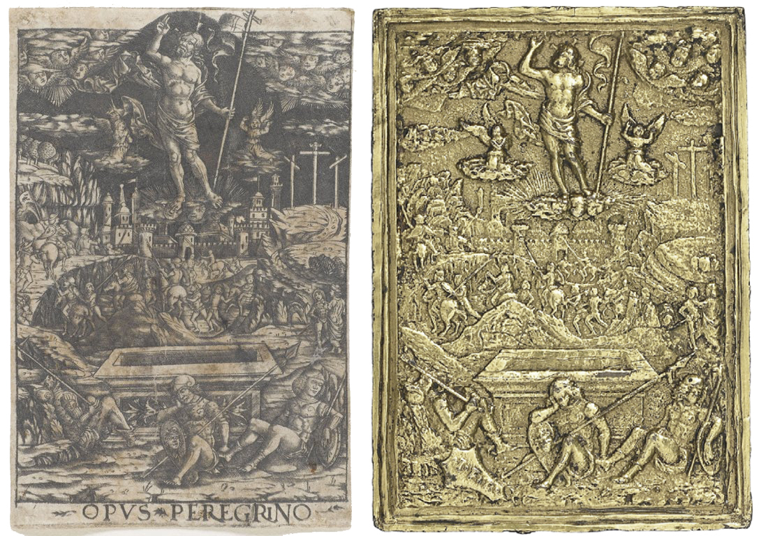 Fig. 7: Niello print of the Resurrection of Christ by Peregrino da Cesena, ca. 1500 (left; Louvre, inv. 22 Ni); bronze plaquette of the Resurrection of Christ probably by Peregrino da Cesena, ca. 1500 (right; collection of Mario Scaglia)