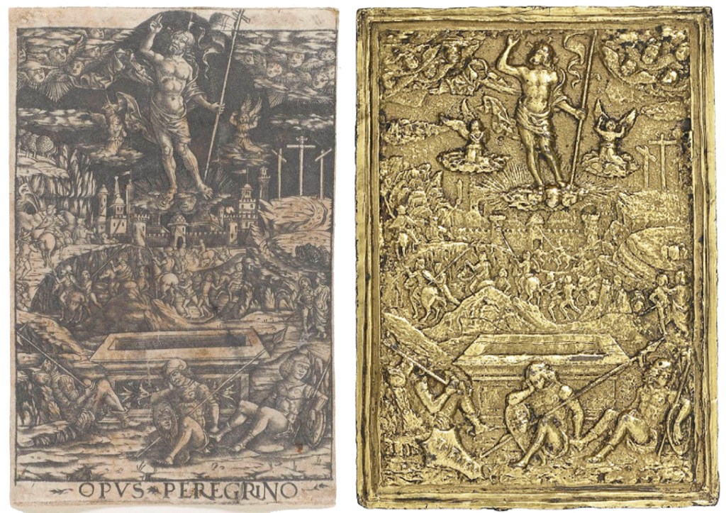 The paxes of San Petronio and San Martino represent a distinct moment in Bolognese goldsmithing. They are the product of a collaborative hierarchy where the invenzione of the Aspertini circle—rich in antiquarian and Northern references—was translated into silver by a master trained in the rigors of the Mint. This connection is further reinforced by the bronze plaquette of the Resurrection signed I.F.P. (interpreted as Invenit Fecit Peregrino).25 The existence of the Resurrection as both a print and a relief plaquette demonstrates that Peregrino and his circle conceived of their designs as three-dimensional metalwork (fig. 7).26